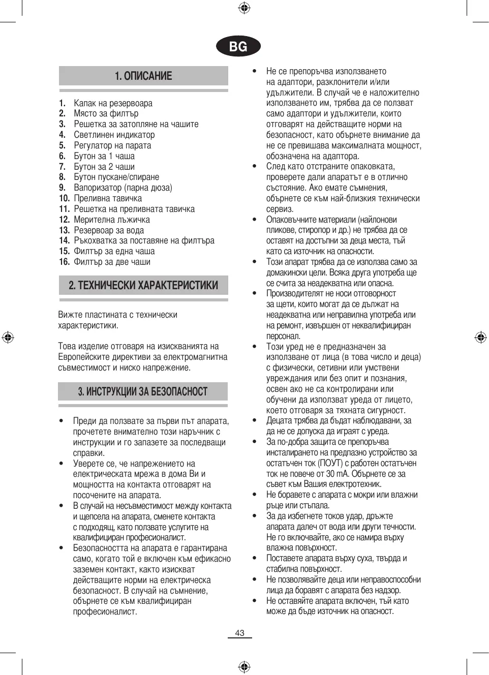 Преди да ползвате за първи път апарата, прочетете внимателно този наръчник с инструкции и го запазете за последващи Уверете се, че напрежението на електрическата мрежа в дома Ви и мощността на контакта отговарят на посочените на апарата. В случай на несъвместимост между контакта и щепсела на апарата, сменете контакта с подходящ, като ползвате услугите на квалифициран професионалист. Безопасността на апарата е гарантирана само, когато той е включен към ефикасно заземен контакт, както изискват действащите норми на електрическа безопасност. В случай на съмнение, обърнете се към квалифициран професионалист.