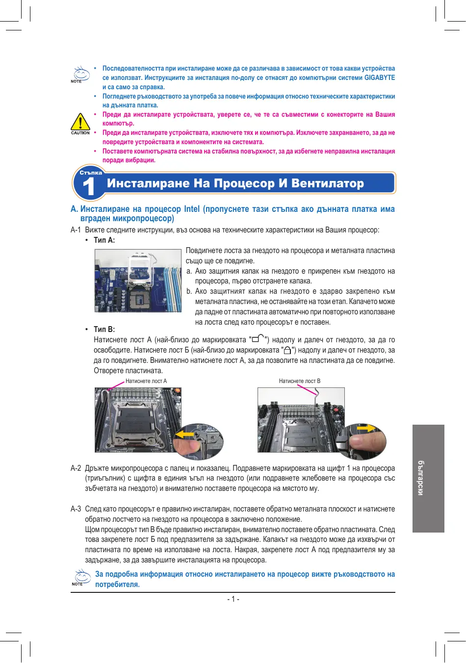 - • Тип B: Натиснете лост А (най-близо до маркировката " ") надолу и далеч от гнездото, за да го освободите. Натиснете лост Б (най-близо до маркировката " ") надолу и далеч от гнездото, за да го повдигнете. Внимателно натиснете лост А, за да позволите на пластината да се повдигне. Отворете пластината. Натиснете лост A Натиснете лост B A-3 След като процесорът е правилно инсталиран, поставете обратно металната плоскост и натиснете обратно лостчето на гнездото на процесора в заключено положение. Щом процесорът тип B бъде правилно инсталиран, внимателно поставете обратно пластината. След това закрепете лост Б под предпазителя за задържане. Капакът на гнездото може да изхвърчи от пластината по време на използване на лоста. Накрая, закрепете лост А под предпазителя му за задържане, за да завършите инсталацията на процесора. За подробна информация относно инсталирането на процесор вижте ръководството на потребителя.