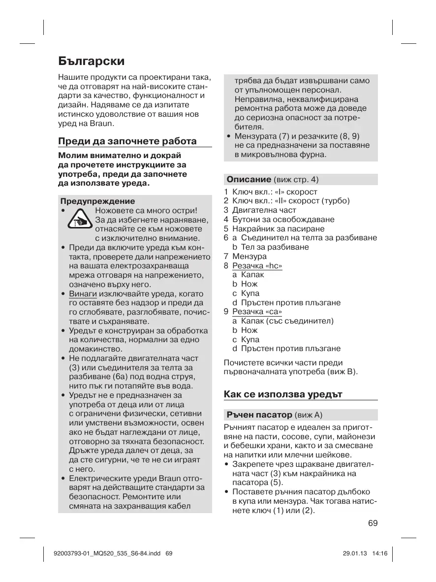 Нашите продукти са проектирани така, че да отговарят на най-високите стандарти за качество, функционалност и дизайн. Надяваме се да изпитате истинско удоволствие от вашия нов уред на Braun. Преди да започнете работа Молим внимателно и докрай да прочетете инструкциите за употреба, преди да започнете да използвате уреда. Предупреждение Ножовете са много остри! За да избегнете нараняване, отнасяйте се към ножовете с изключително внимание.