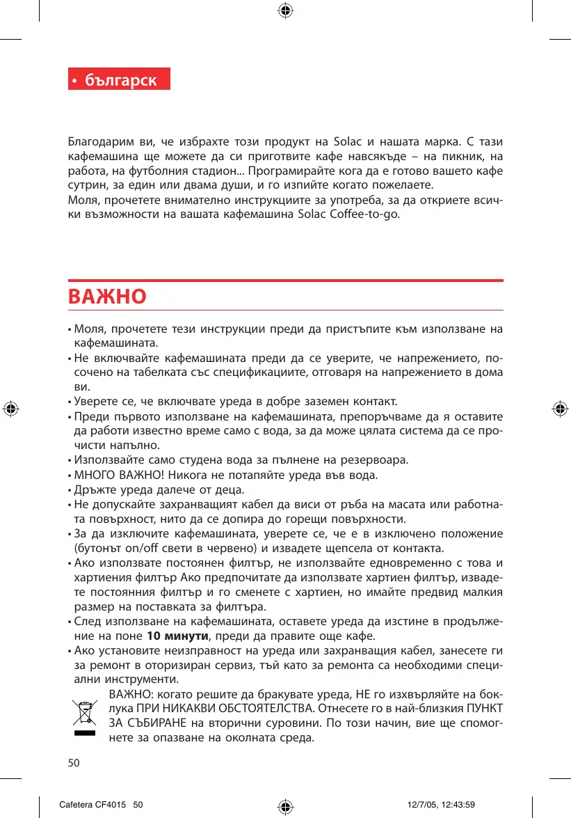 - Ако установите неизправност на уреда или захранващия кабел, занесете ги за ремонт в оторизиран сервиз, тъй като за ремонта са необходими специални инструменти. ВАЖНО: когато решите да бракувате уреда, НЕ го изхвърляйте на боклука ПРИ НИКАКВИ ОБСТОЯТЕЛСТВА. Отнесете го в най-близкия ПУНКТ ЗА СЪБИРАНЕ на вторични суровини. По този начин, вие ще спомогнете за опазване на околната среда.