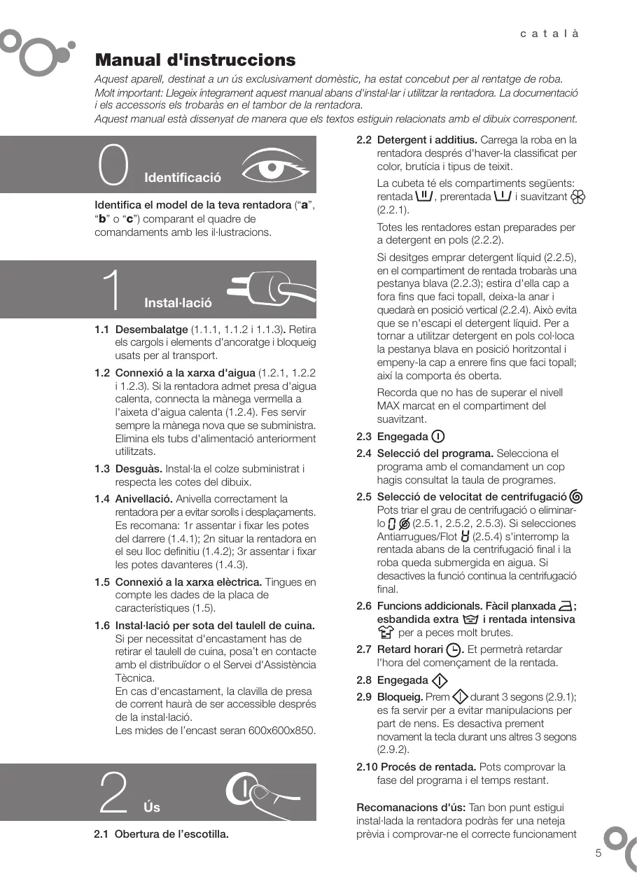 - programa para valoración de lavado y consumo de energía según norma EN60456, accionando tecla de lavado intensivo. c a t a l à Manual d'instruccions Aquest aparell, destinat a un ús exclusivament domèstic, ha estat concebut per al rentatge de roba. Molt important: Llegeix íntegrament aquest manual abans d'instal·lar i utilitzar la rentadora. La documentació i els accessoris els trobaràs en el tambor de la rentadora. Aquest manual està dissenyat de manera que els textos estiguin relacionats amb el dibuix corresponent.