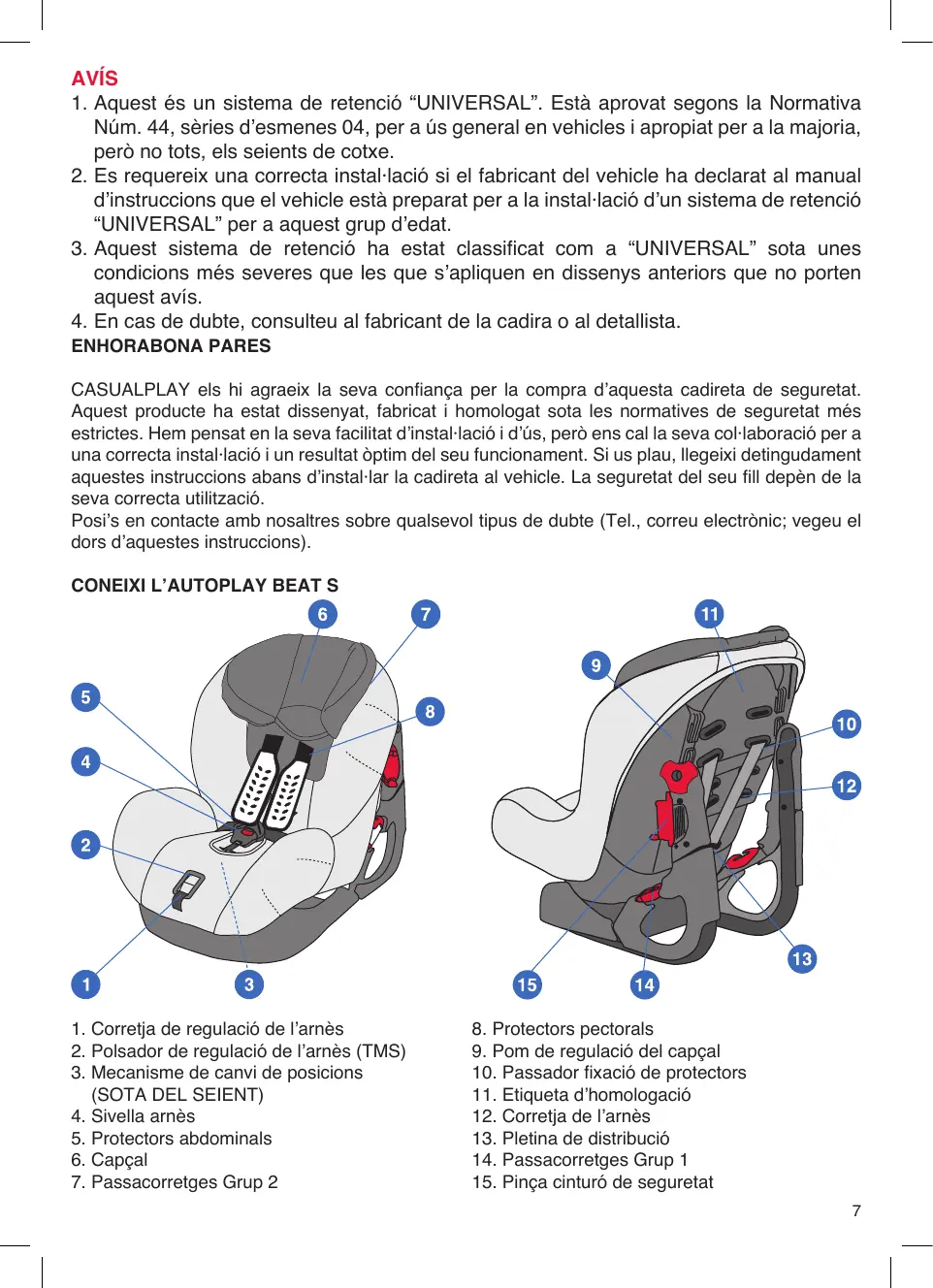 ENHORABONA PARES CASUALPLAY els hi agraeix la seva confiança per la compra d’aquesta cadireta de seguretat. Aquest producte ha estat dissenyat, fabricat i homologat sota les normatives de seguretat més estrictes. Hem pensat en la seva facilitat d’instal·lació i d’ús, però ens cal la seva col·laboració per a una correcta instal·lació i un resultat òptim del seu funcionament. Si us plau, llegeixi detingudament aquestes instruccions abans d’instal·lar la cadireta al vehicle. La seguretat del seu fill depèn de la seva correcta utilització. Posi’s en contacte amb nosaltres sobre qualsevol tipus de dubte (Tel., correu electrònic; vegeu el dors d’aquestes instruccions).