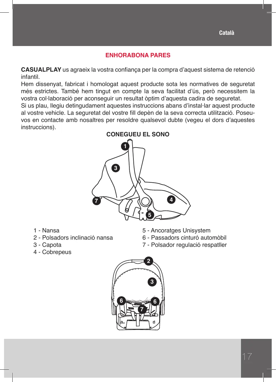 (fig.04). A continuació, pressioneu-les totes dues fins que un “clic” n’indiqui la seva fixació (fig.05). • Per obrir la sivella, pressioneu el polsador vermell. ARNÈS DE SEGURETAT • Tanqueu la sivella i tenseu els tirants pectorals estirant de l’extrem de la corretja del tensor (fig.06), fins que obtingui l’ajust desitjat, tenint la precaució de deixar-hi sempre una certa amplitud. IMPORTANT: Assegureu-vos que els tirants de l’arnès no estan recargolats. • Per destensar l’arnès, pressioneu el botó del tensor i estireu dels tirants pectorals amb l’altra mà (fig.07). AJUST DE L’ALTURA DE L’ARNÈS • Localitzeu la platina de metall situada a la part inferior del respatller del Sono (fig.08) i allibereu les corretges de l’espatlla de l’arnès. Traieu les corretges de l’espatlla de les ranures del seient i del matalasset. • Introduïu les corretges de l’espatlla a les ranures adequades (fig.09) i torneu-les a introduir a la forqueta de metall, assegurant-vos que estiguin ben col·locades. Comproveu que les corretges no quedin recargolades. IMPORTANT: Les corretges, en sortir del respatller, han de quedar a l’altura de les espatlles del nen i totes dues al mateix nivell (fig.10). INSTAL·LACIÓ DEL SONO A L’AUTOMÒBIL • Col·loqueu la nansa en la posició A - fig.02. • Subjecteu la sivella del cinturó de l’automòbil i passeu la corretja abdominal pels dos passacorretges inferiors (fig.11). • A continuació, passeu la corretja pectoral pel passacorretges superior del costat del retractor (fig.12). ATENCIÓ: Ajusteu el tensament del cinturó cada vegada que canviï la posició del respatller. • Finalment, tenseu el cinturó estirant de la corretja pectoral (fig.13). • Obriu la sivella de l’arnès. • Retireu els protectors pectorals i el bebè reductor. Passeu les corretges de l’arnès a través de les obertures de la vestidura. • Desenfundeu la vestidura començant per la part frontal. UNISYSTEM Aquest sistema exclusiu d’ancoratges permet que el Sono es pugui utilitzar en les següents cadires de passeig: Avant, Livi, Kudu, Kudu 4, S4, S-Twinner. En tots, el procediment per al seu muntatge és el següent: • Accioneu el fre d’estacionament. • Situeu el Sono a la cadira de passeig, mirant cap enrere.