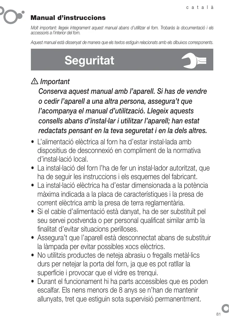 Si el cable d’alimentació està danyat, ha de ser substituït pel seu servei postvenda o per personal qualificat similar amb la finalitat d’evitar situacions perilloses. Assegura’t que l’aparell està desconnectat abans de substituir la làmpada per evitar possibles xocs elèctrics. No utilitzis productes de neteja abrasiu o fregalls metàl·lics durs per netejar la porta del forn, ja que es pot ratllar la superfície i provocar que el vidre es trenqui. Durant el funcionament hi ha parts accessibles que es poden escalfar. Els nens menors de 8 anys se n’han de mantenir allunyats, tret que estiguin sota supervisió permanentment. 81
