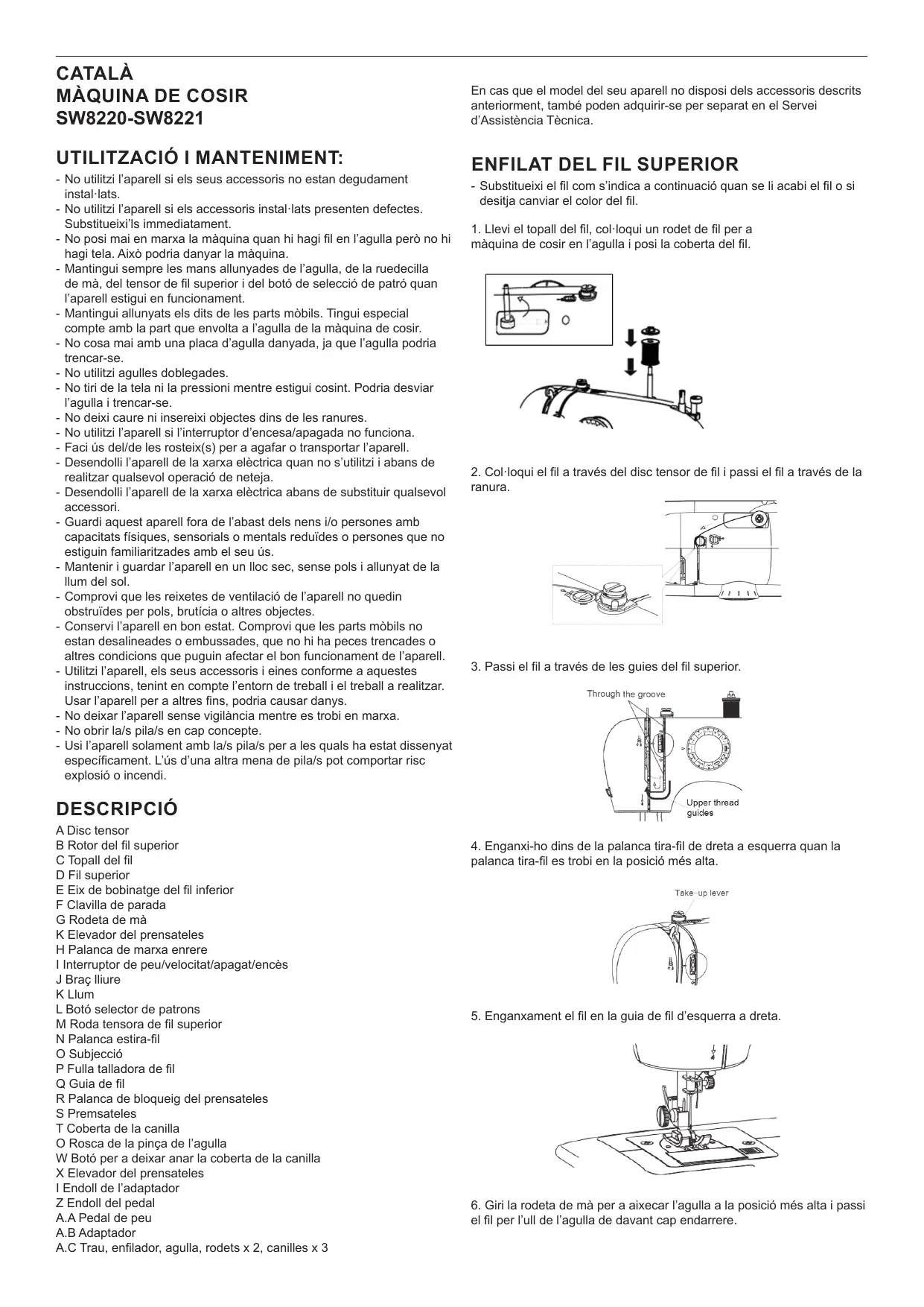 T Coberta de la canilla O Rosca de la pinça de l’agulla W Botó per a deixar anar la coberta de la canilla X Elevador del prensateles I Endoll de l’adaptador Z Endoll del pedal A.A Pedal de peu A.B Adaptador A.C Trau, enfilador, agulla, rodets x 2, canilles x 3 4. Subjecti l’extrem del fil superior i giri la rodeta de mà cap a vostè (en sentit contrari a les agulles del rellotge) mentre tira suaument del fil superior fins que el fil de la canilla surti des de la ranura de fil d’aquesta.