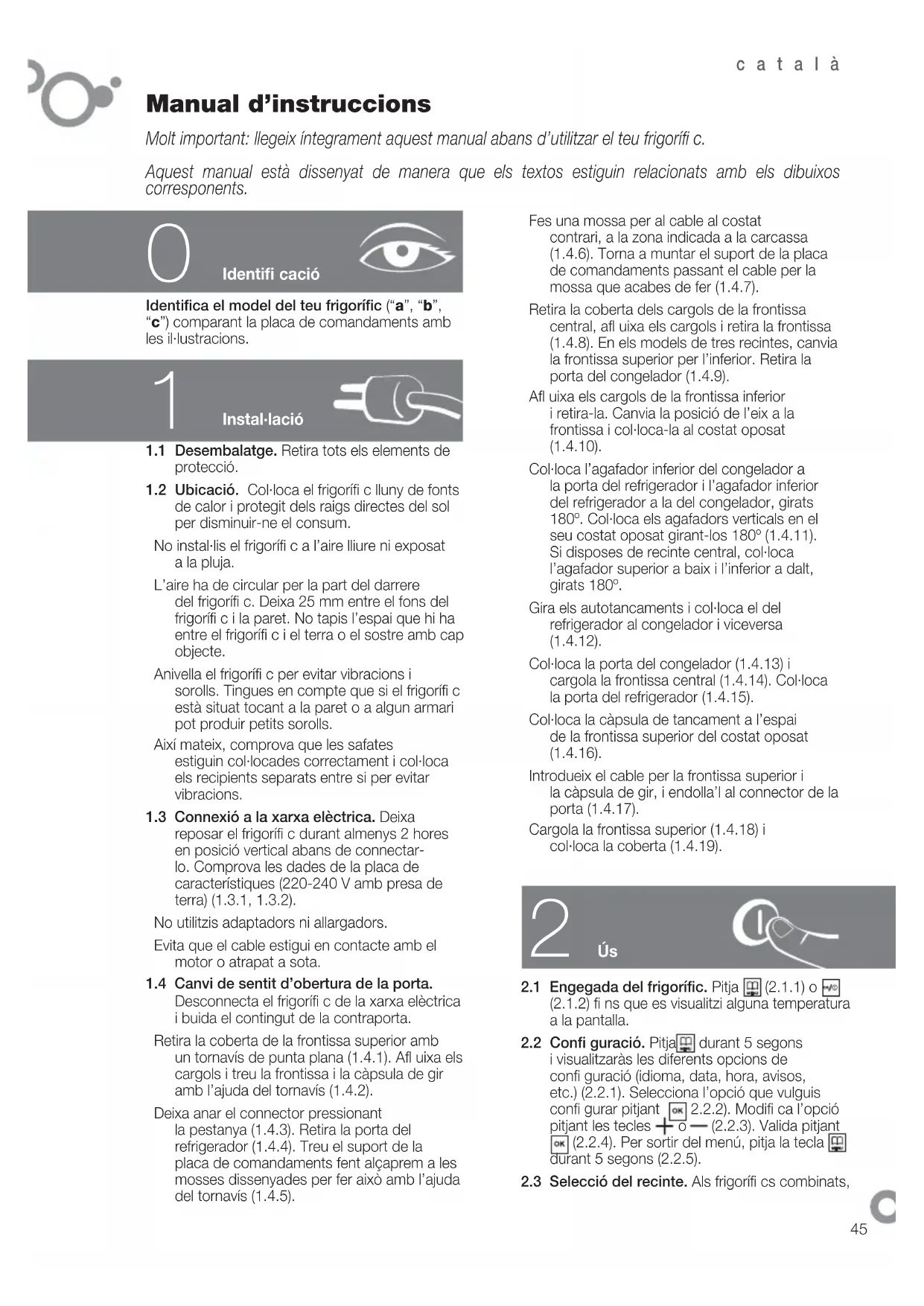 Manual d’instruccions Molt important: llegeix íntegrament aquest manual abans d’utilitzar el teu frigorífi c. Aquest manual està dissenyat de manera que els textos estiguin relacionats amb els dibuixos corresponents. Instal·lació Identifi ca el model del teu frigorífi c (“a”, “b”, “c”) comparant la placa de comandaments amb les il·lustracions.