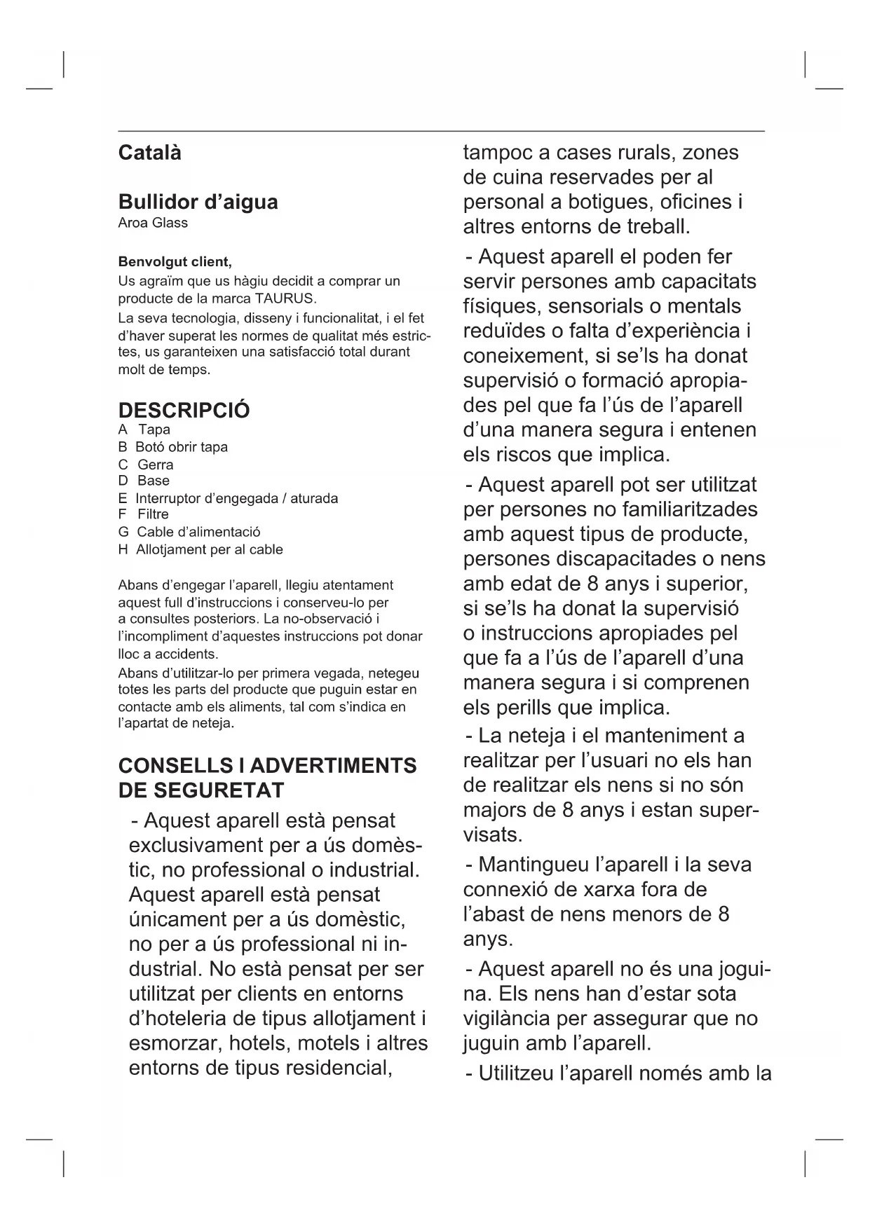 - Els materials que componen l’envàs d’aquest electrodomèstic estan integrats en un sistema de recollida, classicació i reciclatge. Si us en voleu desfer, utilitzeu els contenidors públics adequats per a cada tipus de material. - Aquest producte està exempt de concentracions de substàncies que es puguin considerar perju- dicials per al medi ambient. Aquest símbol signica que si us voleu desfer del producte, un cop exhaurida la vida de l’aparell, l’heu de dipositar, a través dels mitjans adequats, a mans d’un gestor de residus autoritzat per a la recollida selectiva de Residus d’Aparells Elèctrics i Electrònics (RAEE). Aquest aparell compleix amb la Directiva 2006/95/EC de Baixa Tensió, amb la Directiva 2004/108/EC de Compatibilitat Electromagnètica, amb la Directiva 2011/65/EC sobre restriccions a la utilització de determinades substàncies perilloses en aparells elèctrics i electrònics i amb la Directiva 2009/125/EC sobre els requisits de disseny ecològic aplicable als productes relacio- nats amb l’energia.English Kettle Aroa Glass Dear customer, Many thanks for choosing to purchase a TAURUS brand product. Thanks to its technology, design and operation and the fact that it exceeds the strictest quality standards, a fully satisfactory use and long pro- duct life can be assured. DESCRIPTION A Lid B Lid opening button C Jar D Base E On/off switch F Filter G Supply cable H Cord housing Read these instructions carefully before swit- ching on the appliance and keep them for future reference. Failure to follow and observe these instructions may result in an accident. Failure to follow and observe these instructions may result in an accident. Clean all the parts of the product that will be in contact with food, as indicated in the cleaning section, before use.