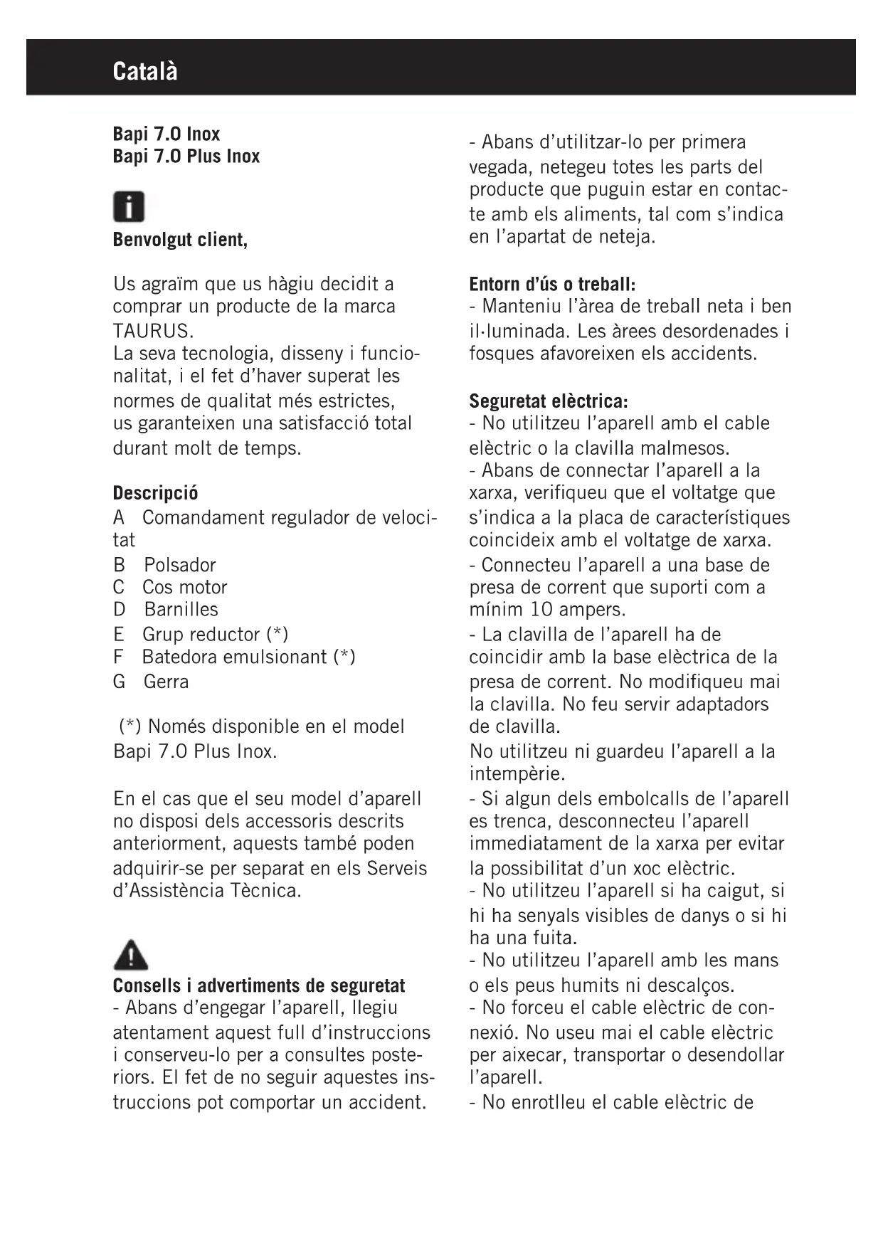 Bapi 7.0 Plus Inox - Batedora TAURUS - Notice d'utilisation et mode d'emploi gratuit