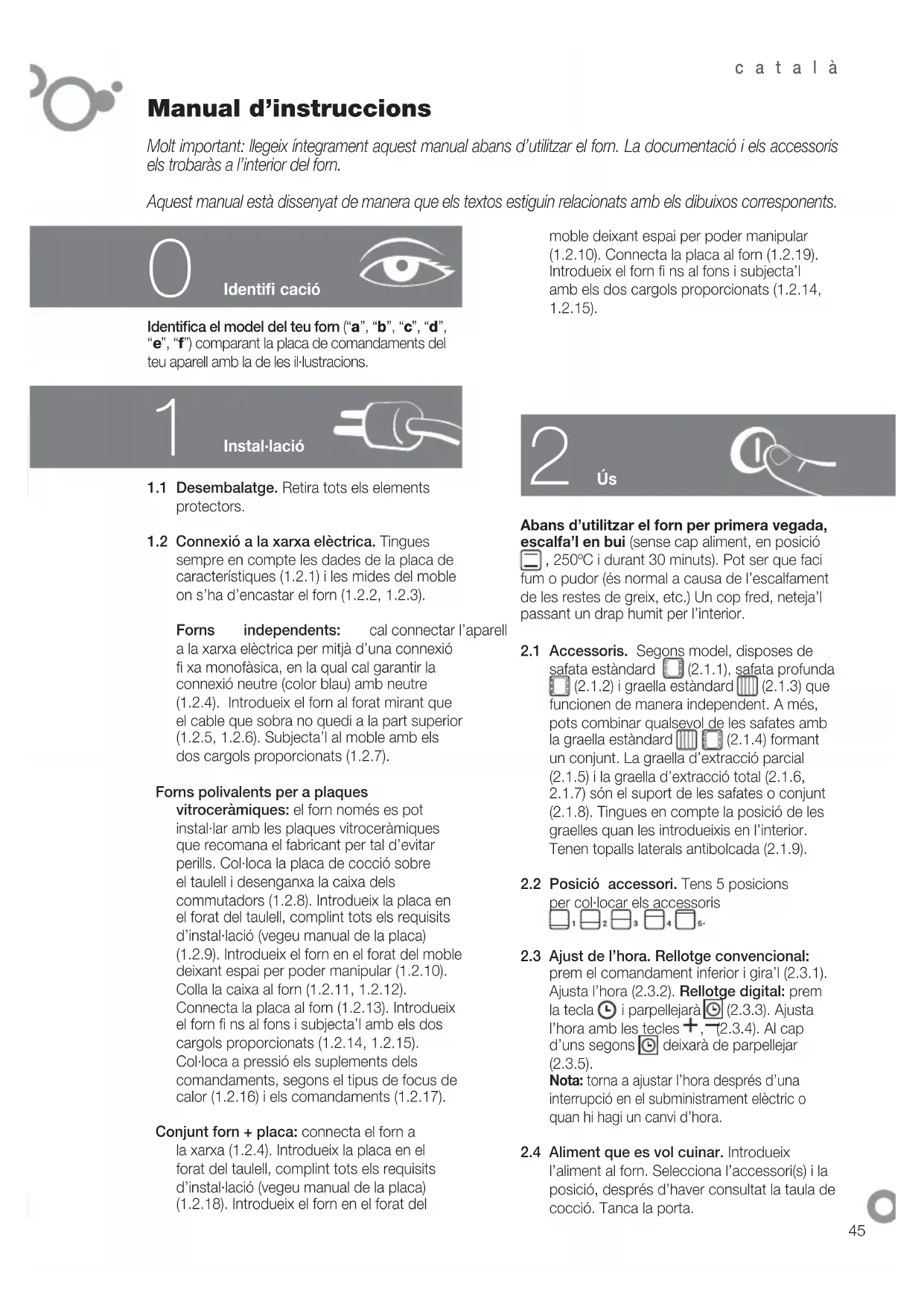 sempre en compte les dades de la placa de característiques (1.2.1) i les mides del moble on s’ha d’encastar el forn (1.2.2, 1.2.3). Forns independents: cal connectar l’aparell a la xarxa elèctrica per mitjà d’una connexió fi xa monofàsica, en la qual cal garantir la connexió neutre (color blau) amb neutre (1.2.4). Introdueix el forn al forat mirant que el cable que sobra no quedi a la part superior (1.2.5, 1.2.6). Subjecta’l al moble amb els dos cargols proporcionats (1.2.7). Forns polivalents per a plaques vitroceràmiques: el forn només es pot instal·lar amb les plaques vitroceràmiques que recomana el fabricant per tal d’evitar perills. Col·loca la placa de cocció sobre el taulell i desenganxa la caixa dels commutadors (1.2.8). Introdueix la placa en el forat del taulell, complint tots els requisits d’instal·lació (vegeu manual de la placa) (1.2.9). Introdueix el forn en el forat del moble deixant espai per poder manipular (1.2.10). Colla la caixa al forn (1.2.11, 1.2.12). Connecta la placa al forn (1.2.13). Introdueix el forn fi ns al fons i subjecta’l amb els dos cargols proporcionats (1.2.14, 1.2.15). Col·loca a pressió els suplements dels comandaments, segons el tipus de focus de calor (1.2.16) i els comandaments (1.2.17). Conjunt forn + placa: connecta el forn a la xarxa (1.2.4). Introdueix la placa en el forat del taulell, complint tots els requisits d’instal·lació (vegeu manual de la placa) (1.2.18). Introdueix el forn en el forat del