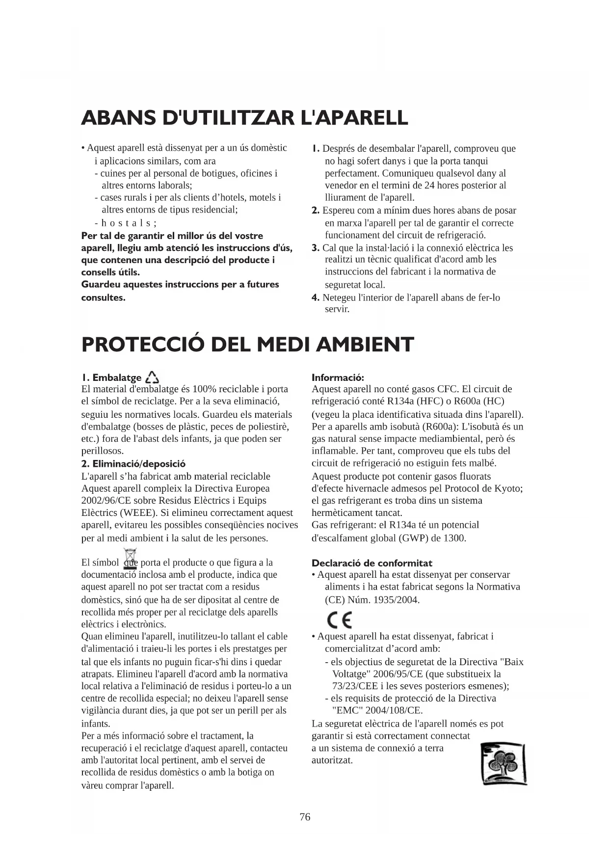 refrigeració conté R134a (HFC) o R600a (HC)