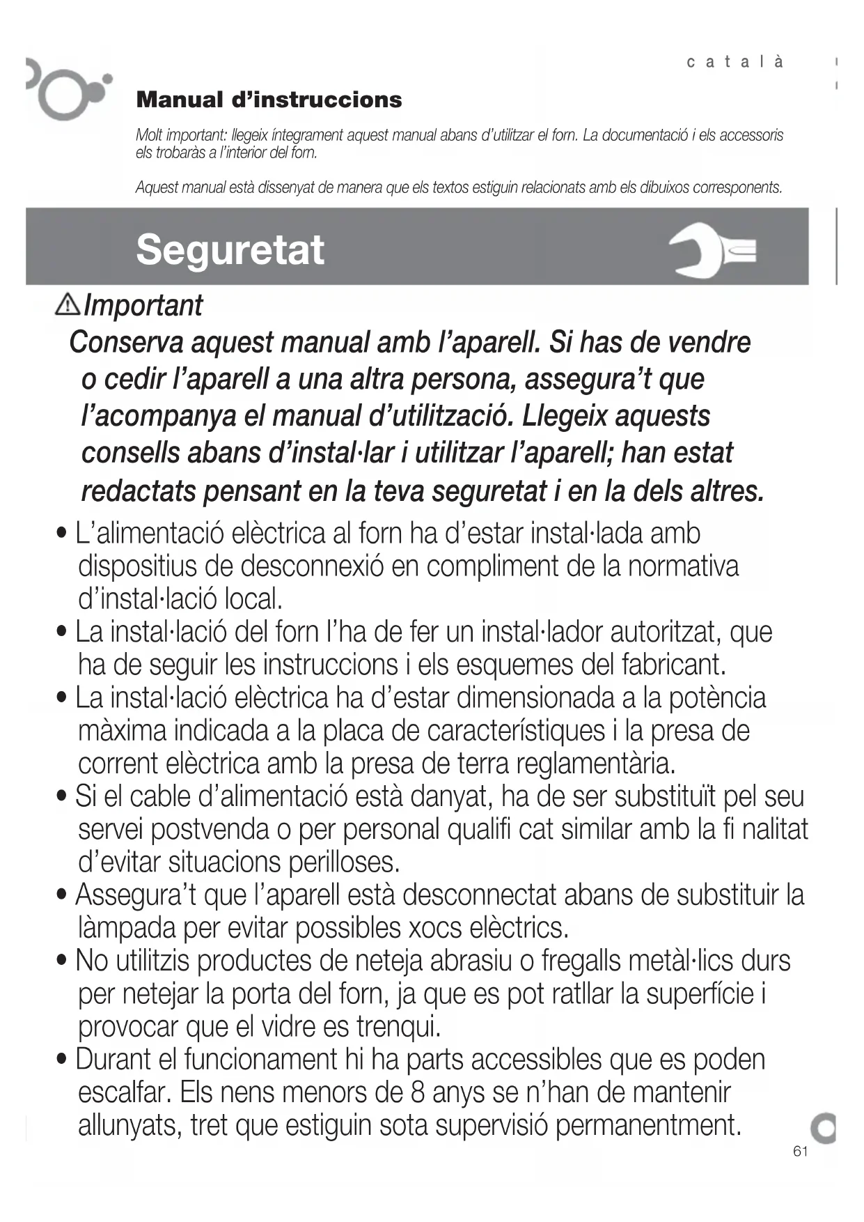 - Durant el funcionament hi ha parts accessibles que es poden escalfar. Els nens menors de 8 anys se n’han de mantenir allunyats, tret que estiguin sota supervisió permanentment. Important Conserva aquest manual amb l’aparell. Si has de vendre o cedir l’aparell a una altra persona, assegura’t que l’acompanya el manual d’utilització. Llegeix aquests consells abans d’instal·lar i utilitzar l’aparell; han estat redactats pensant en la teva seguretat i en la dels altres. Manual d’instruccions Molt important: llegeix íntegrament aquest manual abans d’utilitzar el forn. La documentació i els accessoris els trobaràs a l’interior del forn. Aquest manual està dissenyat de manera que els textos estiguin relacionats amb els dibuixos corresponents.62 català