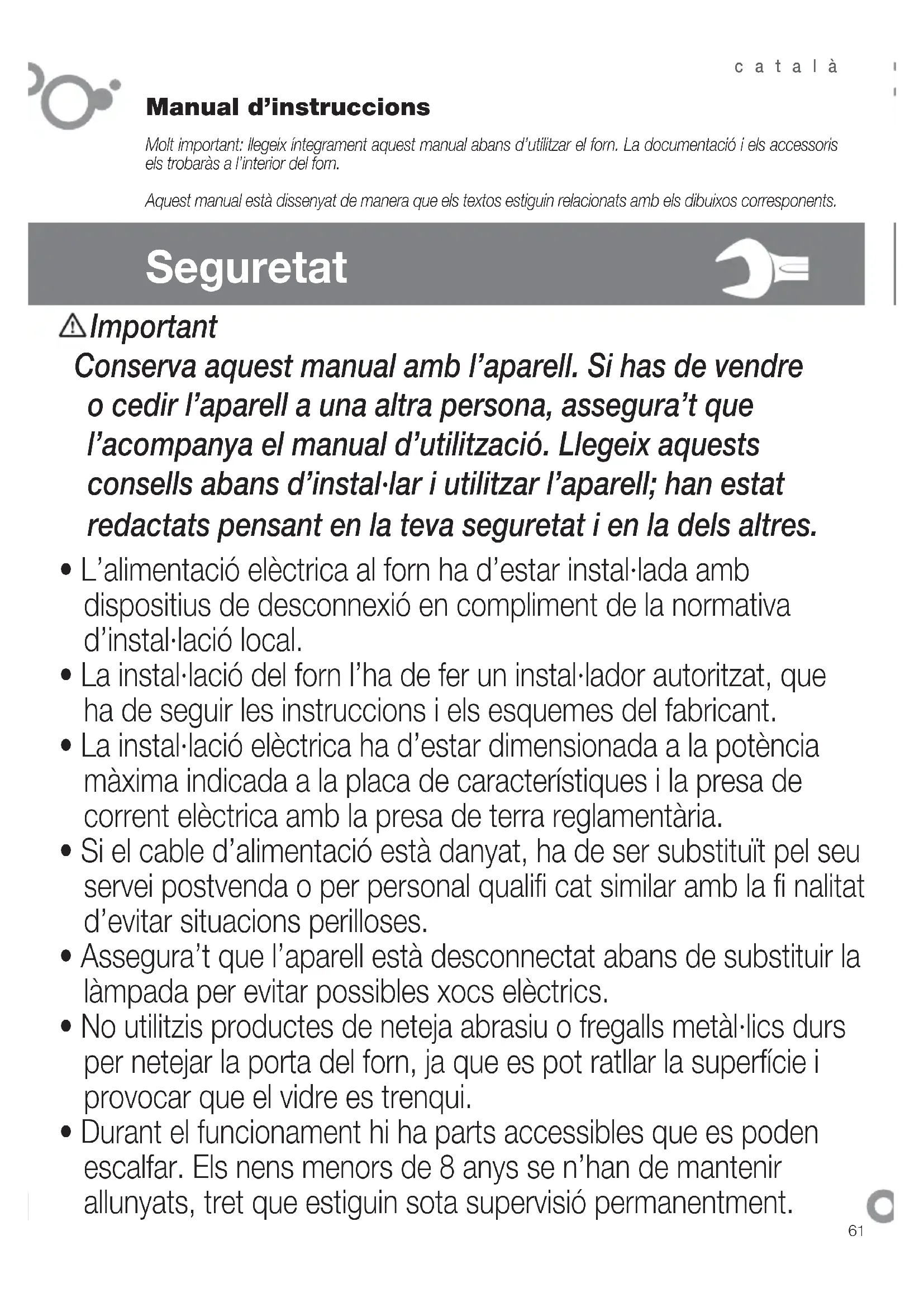 - Durant el funcionament hi ha parts accessibles que es poden escalfar. Els nens menors de 8 anys se n’han de mantenir allunyats, tret que estiguin sota supervisió permanentment. Important Conserva aquest manual amb l’aparell. Si has de vendre o cedir l’aparell a una altra persona, assegura’t que l’acompanya el manual d’utilització. Llegeix aquests consells abans d’instal·lar i utilitzar l’aparell; han estat redactats pensant en la teva seguretat i en la dels altres. Manual d’instruccions Molt important: llegeix íntegrament aquest manual abans d’utilitzar el forn. La documentació i els accessoris els trobaràs a l’interior del forn. Aquest manual està dissenyat de manera que els textos estiguin relacionats amb els dibuixos corresponents.62 català