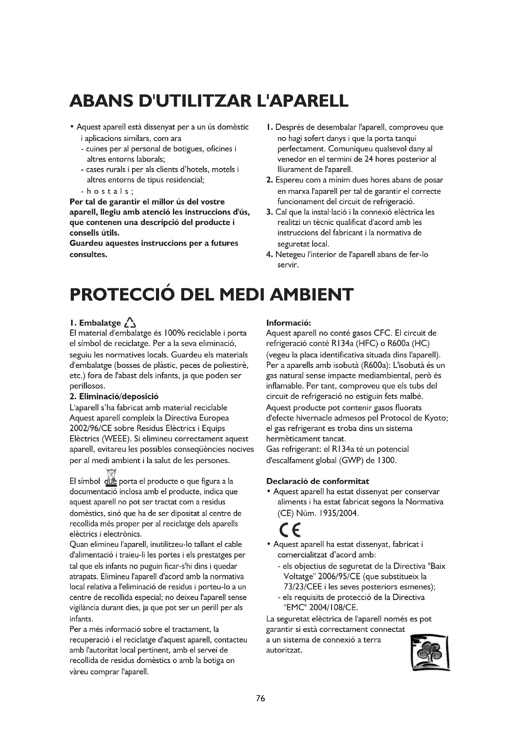L'aparell s’ha fabricat amb material reciclable Aquest aparell compleix la Directiva Europea 2002/96/CE sobre Residus Elèctrics i Equips Elèctrics (WEEE). Si elimineu correctament aquest aparell, evitareu les possibles conseqüències nocives per al medi ambient i la salut de les persones. El símbol que porta el producte o que figura a la documentació inclosa amb el producte, indica que aquest aparell no pot ser tractat com a residus domèstics, sinó que ha de ser dipositat al centre de recollida més proper per al reciclatge dels aparells elèctrics i electrònics. Quan elimineu l'aparell, inutilitzeu-lo tallant el cable d'alimentació i traieu-li les portes i els prestatges per tal que els infants no puguin ficar-s'hi dins i quedar atrapats. Elimineu l'aparell d'acord amb la normativa local relativa a l'eliminació de residus i porteu-lo a un centre de recollida especial; no deixeu l'aparell sense vigilància durant dies, ja que pot ser un perill per als infants. Per a més informació sobre el tractament, la recuperació i el reciclatge d'aquest aparell, contacteu amb l'autoritat local pertinent, amb el servei de recollida de residus domèstics o amb la botiga on vàreu comprar l'aparell. Informació: Aquest aparell no conté gasos CFC. El circuit de refrigeració conté R134a (HFC) o R600a (HC) (vegeu la placa identificativa situada dins l'aparell). Per a aparells amb isobutà (R600a): L'isobutà és un gas natural sense impacte mediambiental, però és inflamable. Per tant, comproveu que els tubs del circuit de refrigeració no estiguin fets malbé. Aquest producte pot contenir gasos fluorats d'efecte hivernacle admesos pel Protocol de Kyoto; el gas refrigerant es troba dins un sistema hermèticament tancat. Gas refrigerant: el R134a té un potencial d'escalfament global (GWP) de 1300. Declaració de conformitat