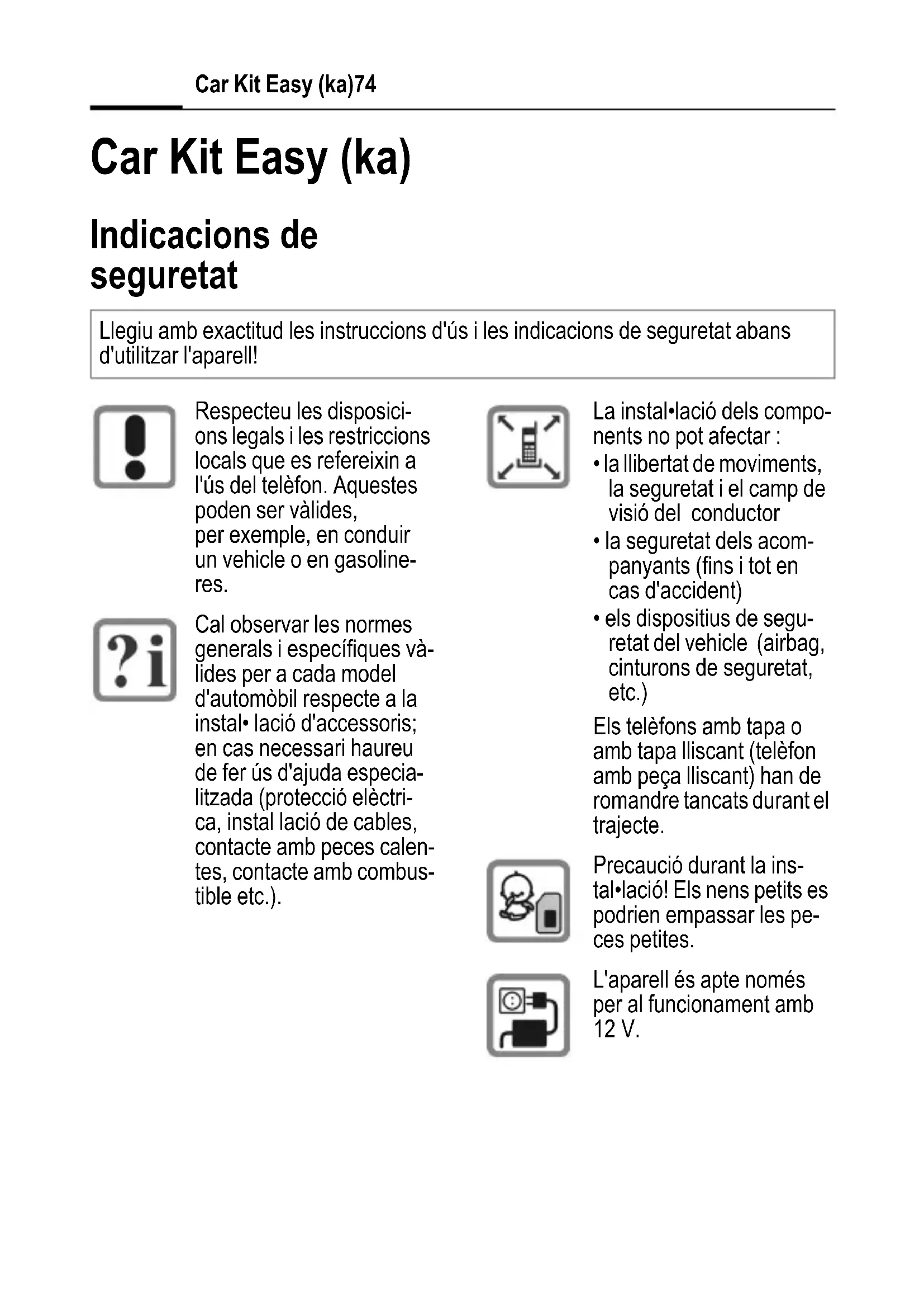 - Ekstra holdeplater Produktene får du i spesialforretninger, eller du kan besøke vår online-butikk: I land der vårt produkt ikke selges av autoriserte forhandlere, blir det ikke tilbudt utskiftings- eller repara- sjonsarbeider. Spenningstil- førsel 10,8 V til 16 V Strømforbruk maks. 1 A / maks. 1 mA (hvilestrøm) Driftstempera- tur –20°C til +55°C Utgangseffekt for høyttaler maks. 1,3 W Siemens Original Accessories www.siemens- mobile.com/shopCar Kit Easy (ka)74 Car Kit Easy (ka) Indicacions de seguretat Llegiu amb exactitud les instruccions d'ús i les indicacions de seguretat abans d'utilitzar l'aparell! Respecteu les disposici- ons legals i les restriccions locals que es refereixin a l'ús del telèfon. Aquestes poden ser vàlides, per exemple, en conduir un vehicle o en gasoline- res. Cal observar les normes generals i específiques và- lides per a cada model d'automòbil respecte a la instal• lació d'accessoris; en cas necessari haureu de fer ús d'ajuda especia- litzada (protecció elèctri- ca, instal lació de cables, contacte amb peces calen- tes, contacte amb combus- tible etc.). La instal•lació dels compo- nents no pot afectar :
