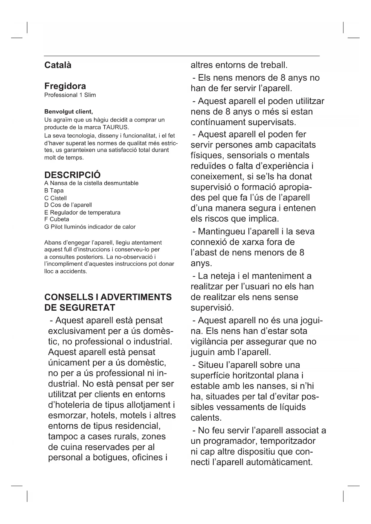 - Els materials que componen l’envàs d’aquest electrodomèstic estan integrats en un sistema de recollida, classicació i reciclatge. Si us en voleu desfer, utilitzeu els contenidors públics adequats per a cada tipus de material. - Aquest producte està exempt de concentracions de substàncies que es puguin considerar perju- dicials per al medi ambient. - Aquest aparell conté o pot contenir oli. Recor- deu que s’han de respectar els reglaments concernents a l’eliminació d’aquest tipus de contaminant. Aquest símbol signica que si us voleu desfer del producte, un cop exhaurida la vida de l’aparell, l’heu de dipositar, a través dels mitjans adequats, a mans d’un gestor de residus autoritzat per a la recollida selectiva de Residus d’Aparells Elèctrics i Electrònics (RAEE). Aquest aparell compleix amb la Directiva 2014/35/EU de Baixa Tensió, amb la Directiva 2014/30/EU de Compatibilitat Electromagnètica, amb la Directiva 2011/65/EU sobre restriccions a la utilització de determinades substàncies perilloses en aparells elèctrics i electrònics i amb la Directiva 2009/125/EC sobre els requisits de disseny ecològic aplicable als productes relacio- nats amb l’energia.English Deep fryer Professional 1 Slim Dear customer, Many thanks for choosing to purchase a TAURUS brand product. Thanks to its technology, design and operation and the fact that it exceeds the strictest quality standards, a fully satisfactory use and long pro- duct life can be assured. DESCRIPTION A Removable basket handle B Lid C Basket D Appliance body E Temperature regulator F Tank G Heat pilot light Read these instructions carefully before swit- ching on the appliance and keep them for future reference. Failure to follow and observe these instructions may result in an accident. Failure to follow and observe these instructions may result in an accident.