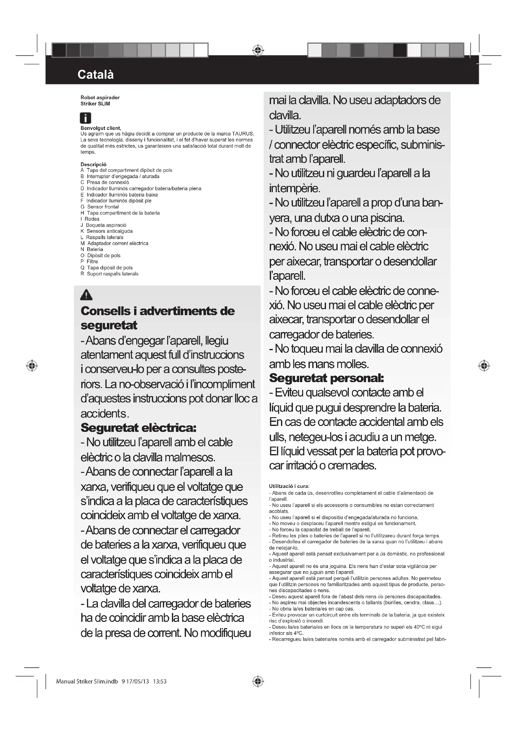 El aparato se desplaza hacia atrás después de ponerlo en marcha. El aparato se encuentra en una supercie de color oscuro (bajo reejo de la luz contra el suelo) Ajuste los dos sensores de altura en la posi- ción 2 o 3. Manual Striker Slim.indb 7 17/05/13 13:53- En caso de avería llevar el aparato a un Servicio de Asistencia Técnica autori- zado. No intente desmontarlo o repararlo ya que puede existir peligro. - Si la conexión red está dañada, debe ser substituida, proceder como en caso de avería. Para las versiones EU del producto y/o en el caso de que en su país aplique: Ecología y reciclabilidad del producto - Los materiales que constituyen el envase de este aparato, están integrados en un sistema de recogida, clasicación y reciclado de los mismos. Si desea deshacerse de ellos, puede utilizar los contenedores públicos apropiados para cada tipo de material. - El producto está exento de concentraciones de sustancias que se puedan considerar dañinas para el medio ambiente. Este símbolo signica que si desea deshacerse del producto, una vez transcurrida la vida del mismo, debe depositarlo por los medios adecuados a manos de un gestor de residuos autorizado para la recogida selectiva de Residuos de Aparatos Eléctricos y Electrónicos (RAEE). Este símbolo signica que el producto puede disponer de pilas o baterías en su interior, las cuales deben ser retiradas previamente antes de deshacerse del producto. Recuerde que las pilas/baterías deben depositarse en contenedores especiales autorizados. Y que nunca deben tirarse al fuego. Como retirar de las baterías del interior del aparato: Advertencia: Es importante que las baterías se encuentren completamente descargadas antes de proceder a su retirada del aparato. Para retirar las baterías, una vez nalizada la vida del aparato, proceder como sigue: - Retirar la tapa del compartimiento de la batería. - Retirar la batería de su alojamiento. - Cerrar de nuevo la tapa del compartimiento de la batería. Este aparato cumple con la Directiva 2006/95/EC de Baja Tensión y con la Directiva 2004/108/EC de Compatibilidad Electromagnética. Manual Striker Slim.indb 8 17/05/13 13:53Robot aspirador Striker SLIM Benvolgut client, Us agraïm que us hàgiu decidit a comprar un producte de la marca TAURUS. La seva tecnologia, disseny i funcionalitat, i el fet d’haver superat les normes de qualitat més estrictes, us garanteixen una satisfacció total durant molt de temps. Descripció A Tapa del compartiment dipòsit de pols B Interruptor d’engegada / aturada C Presa de connexió D Indicador lluminós carregador bateria/bateria plena E Indicador lluminós bateria baixa F Indicador lluminós dipòsit ple G Sensor frontal H Tapa compartiment de la bateria I Rodes J Boqueta aspiració K Sensors anticaiguda L Raspalls laterals M Adaptador corrent elèctrica N Bateria O Dipòsit de pols P Filtre Q Tapa dipòsit de pols R Suport raspalls laterals Consells i advertiments de seguretat - Abans d’engegar l’aparell, llegiu atentament aquest full d’instruccions i conserveu-lo per a consultes poste- riors. La no-observació i l’incompliment d’aquestes instruccions pot donar lloc a accidents. Seguretat elèctrica: - No utilitzeu l’aparell amb el cable elèctric o la clavilla malmesos. - Abans de connectar l’aparell a la xarxa, verifiqueu que el voltatge que s’indica a la placa de característiques coincideix amb el voltatge de xarxa. - Abans de connectar el carregador de bateries a la xarxa, verifiqueu que el voltatge que s’indica a la placa de característiques coincideix amb el voltatge de xarxa. - La clavilla del carregador de bateries ha de coincidir amb la base elèctrica de la presa de corrent. No modifiqueu mai la clavilla. No useu adaptadors de clavilla. - Utilitzeu l’aparell només amb la base / connector elèctric espe cífic, subminis- trat amb l’aparell. - No utilitzeu ni guardeu l’aparell a la intempèrie. - No utilitzeu l’aparell a prop d’una ban- yera, una dutxa o una piscina. - No forceu el cable elèctric de con- nexió. No useu mai el cable elèctric per aixecar, transportar o desendollar l’aparell. - No forceu el cable elèctric de conne- xió. No useu mai el cable elèctric per aixecar, transportar o desendollar el carregador de bateries. - No toqueu mai la clavilla de connexió amb les mans molles. Seguretat personal: - Eviteu qualsevol contacte amb el líquid que pugui desprendre la bateria. En cas de contacte accidental amb els ulls, netegeu-los i acudiu a un metge. El líquid vessat per la bateria pot provo- car irritació o cremades. Utilització i cura: - Abans de cada ús, desenrotlleu completament el cable d’alimentació de l’aparell. - No useu l’aparell si els accessoris o consumibles no estan correctament acoblats. - No useu l’aparell si el dispositiu d’engegada/aturada no funciona. - No moveu o desplaceu l’aparell mentre estigui en funcionament. - No forceu la capacitat de treball de l’aparell. - Retireu les piles o bateries de l’aparell si no l’utilitzareu durant força temps. - Desendolleu el carregador de bateries de la xarxa quan no l’utilitzeu i abans de netejar-lo. - Aquest aparell està pensat exclusivament per a ús domèstic, no professional o industrial. - Aquest aparell no és una joguina. Els nens han d’estar sota vigilància per assegurar que no juguin amb l’aparell. - Aquest aparell està pensat perquè l’utilitzin persones adultes. No permeteu que l’utilitzin persones no familiaritzades amb aquest tipus de producte, perso- nes discapacitades o nens. - Deseu aquest aparell fora de l’abast dels nens i/o persones discapacitades. - No aspireu mai objectes incandescents o tallants (burilles, cendra, claus…). - No obriu la/es bateria/es en cap cas. - Eviteu provocar un curtcircuit entre els terminals de la bateria, ja que existeix risc d’explosió o incendi. - Deseu la/es bateria/es en llocs on la temperatura no superi els 40ºC ni sigui inferior als