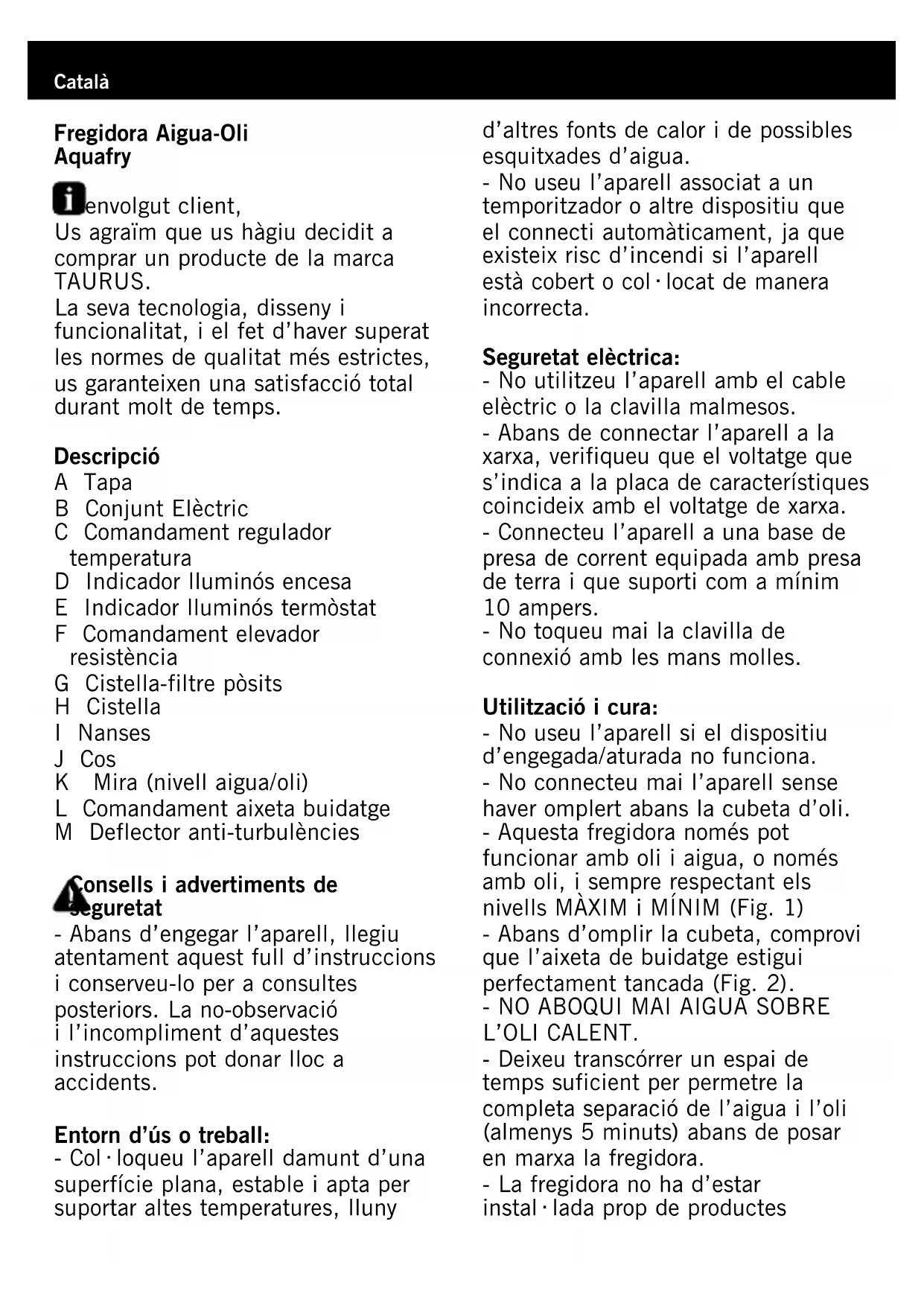 L’OLI CALENT. - Deixeu transcórrer un espai de temps suficient per permetre la completa separació de l’aigua i l’oli (almenys 5 minuts) abans de posar en marxa la fregidora. - La fregidora no ha d’estar instal·lada prop de productesque la fregidora funcioni si no està ben muntat. - Aquest mateix sistema de seguretat impedeix que l’aparell es pugui posar en marxa si se supera el nivell màxim d’aigua permès i que està indicat amb un punt vermell al visor de vidre (Fig. 4). - La fregidora té un sistema de protecció per evitar una eventual ebullició de l’aigua. Quan l’aigua sobrepassa una temperatura determinada, la fregidora es desconnecta automàticament. La reconnexió pot trigar entre 2 i 4 hores i durant aquest temps l’aparell ha d’estar desendollat de la xarxa elèctrica. Podeu disminuir aquest període, afegint a la cubeta una petita quantitat d’oli fred. - En cas de sobreescalfament de l’oli, actuarà el dispositiu de seguretat tèrmica i la fregidora deixarà de funcionar. Quan això passi, heu de desconnectar l’aparell de la xarxa i deixar que es refredi. A continuació pressioneu el botó de rearmament situat a la part posterior del conjunt elèctric amb la punta d’un bolígraf o similar per posar novament l’aparell operatiu pel seu funcionament (Fig. 5). - Aquesta fregidora disposa d’un deflector anti-turbulències amb forma d’embut (m). La no utilització d’aquest deflector pot provocar que la fregidora deixi de funcionar temporalment al cap de poques fregides seguides, a causa de l’actuació del limitador tèrmic. - Si el pilot verd no s’encén en endollar l’aparell, pot ser perquè: a) S’ha superat el nivell màxim permès d’aigua a la cubeta (Fig.1). fàcilment inflamables. - Quan la fregidora estigui funcionant, la resistència ha d’estar sempre coberta d’oli. - Aquest aparell està pensat exclusivament per a ús domèstic, no professional o industrial. - Aquest aparell no és una joguina. Els nens han d’estar sota vigilància per assegurar que no juguin amb l’aparell. - Aquest aparell està pensat perquè l’utilitzin persones adultes. No permeteu que l’utilitzin persones no familiaritzades amb aquest tipus de producte, persones discapacitades o nens. - Deseu aquest aparell fora de l’abast dels nens i/o persones discapacitades. - No deixeu mai la fregidora en funcionament sense vigilància, ni a l’abast dels nens, ja que és un aparell elèctric que escalfa oli a altes temperatures i pot ocasionar cremades greus. - No desplaci la fregidora quan estigui funcionant o l’oli estigui encara calent. Amb l’aparell fred, desplaceu-lo per les nanses (Fig. 3) - Si, per qualsevol motiu, l’oli s’incendiés, desconnecteu l’aparell de la xarxa i apagueu el foc amb la tapa, amb una manta o amb un drap gran de cuina. MAI AMB AIGUA. - Posar el comandament termòstat a la posició de mínim (0) no garanteix la desconnexió permanent de l’aparell. - Desendolleu la fregidora si no s’utilitza. Feu-ho estirant de la clavilla, no del cable. - El conjunt elèctric disposa d’un sistema de seguretat que impedeixb) El conjunt elèctric no està col·locat correctament al seu suport. c) Altres avaries. En aquest cas, s’hauria de portar l’aparell a un Servei d’Assistència Tècnica autoritzat per reparar-lo. - Una utilització inadequada o en desacord amb les instruccions d’ús suposa un perill i anul·la la garantia i la responsabilitat del fabricant. Muntatge de la cistella - Traieu la cistella i acobleu el mànec fent-lo pivotar fins que les varetes entrin dins el seu allotjament (Fig. 6). Instruccions d’ús Notes prèvies a l’ús: - Abans d’utilitzar-lo per primera vegada, netegeu totes les parts del producte que puguin estar en contacte amb els aliments, tal com s’indica en l’apartat de neteja. Ompliment d’oli: - Aixequeu la tapa. - Extraïeu la connexió xarxa de l’allotjament que hi ha darrere el conjunt elèctric de la fregidora (Fig.7). - Col·loqueu la cistella-filtre pòsits a la seva posició (sota el conjunt calefactor) per recollir les possibles partícules que puguin desprendre’s durant el procés de fregir. - Per col·locar la cistella-filtre pòsits (G), assegureu-vos que la malla del filtre quedi per sota dels sensors ubicats a l’interior de la cubeta. - Aboqueu-hi aigua barrejada amb un 10% de sal fins que el nivell arribi al punt verd situat a l’espiell (Fig. 4) i, a continuació, l’oli fins a arribar a la marca que indica el nivell MÀXIM (4,5 l + 1 l d’aigua). - Esperi almenys 5 minuts per permetre que es realitzi la completa separació de l’oli i l’aigua. - El nivell de l’aigua cal que estigui sempre entre el punt verd i el vermell. - Pot ser que pugi el nivell d’aigua quan es fregeixen determinats elements. Manteniu aquest nivell entre els dos punts situats a l’espiell. Ús: - Connecteu l’aparell a la xarxa elèctrica. - Després de connectar l’aparell a la xarxa, aquest triga entre 1 i 2 segons a activar els indicadors lluminosos, a causa d’un procés de revisió interna de les funcions de l’aparell. - L’indicador lluminós de color verd encès indica que l’aparell està endollat a la xarxa i en condicions de funcionar normalment. - Seleccioneu la temperatura desitjada per fregir mitjançant el comandament termòstat de regulació. L’indicador lluminós s’encén en color vermell per indicar que l’oli es troba en procés d’escalfament. - Ajusteu l’alçada del conjunt elèctric mitjançant el comandament de regulació de l’alçada de la resistència (Fig. 8) d’acord amb la quantitat d’aliment que es fregirà, de manera que l’oli el cobreixi totalment. L’oli que quedi per sobre de la resistència calefactora és el que realment s’escalfarà per fregir i, per tant, un ajustament correcte d’aquesta alçada permet un estalvi de temps d’escalfament i de fregir i un estalvi d’energia. - Prepareu els aliments que heu def