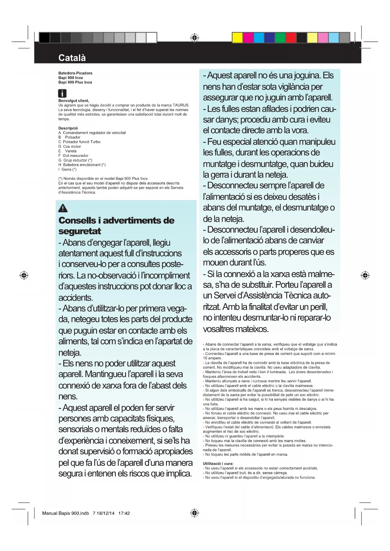 Puré de patatas 20ª 400 g Se pueden trocear actuando directamente sobre el alimento situado en la misma cacerola 30 s Papilla 20ª 300 g Trocear y poner en el recipiente 100 gr. de manzana, 100 gr. de plátano, 50 gr. de galletas y el zumo de una naranja 25 s Pan rallado 20ª 50 g Trocear el pan seco antes de ponerlo en el vaso y picar hasta la textura deseada 50 s Queso rallado 20ª 200 g Trocear a tacos de 1 cm. y picar hasta la textu- ra deseada 30 – 40 s Zanahoria picada 20ª 300 g Pelar la cáscara, trocear a tacos de 1 cm. y picar hasta la textura deseada 20 s Picar frutos secos 20ª 300 g Quitar la cáscara y picar hasta la textura deseada 20 s Picar huevo duro 20ª 5 huevos Cortar a cuartos y picar hasta la textura deseada 10 s Carne picada (cruda o cocida) 20ª 300 g Trocear previamente a tacos de 1 cm. Picar hasta la textura deseada 30 s Picar carne 20ª 40 g Trocear previamente a tacos de 1 cm. Picar hasta la textura deseada 3 s Jugo de tomate 20ª 400 g Cortar los tomates a cuartos y depositarlos en el vaso tamizador actuar sobre ellos, en la jarra quedará el jugo 20 s Picar jamón serrano 20ª 60 g Trocear previamente a tacos de 1 cm. Picar hasta la textura deseada 3 s Picar albarico- ques secos TURBO 60 g Trocear previamente a tacos de 1 cm. Picar hasta la textura deseada 3 s Manual Bapis 900.indb 6 18/12/14 17:42Català Batedora-Picadora Bapi 900 Inox Bapi 900 Plus Inox Benvolgut client, Us agraïm que us hàgiu decidit a comprar un producte de la marca TAURUS. La seva tecnologia, disseny i funcionalitat, i el fet d’haver superat les normes de qualitat més estrictes, us garanteixen una satisfacció total durant molt de temps. Descripció A Comandament regulador de velocitat B Polsador C Polsador funció Turbo D Cos motor E Vareta F Got mesurador G Grup reductor (*) H Batedora emulsionant (*) I Gerra (*) (*) Només disponible en el model Bapi 900 Plus Inox En el cas que el seu model d’aparell no disposi dels accessoris descrits anteriorment, aquests també poden adquirir-se per separat en els Serveis d’Assistència Tècnica. Consells i advertiments de seguretat - Abans d’engegar l’aparell, llegiu atentament aquest full d’instruccions i conserveu-lo per a consultes poste- riors. La no-observació i l’incompliment d’aquestes instruccions pot donar lloc a accidents. - Abans d’utilitzar-lo per primera vega- da, netegeu totes les parts del producte que puguin estar en contacte amb els aliments, tal com s’indica en l’apartat de neteja. - Els nens no poder utilitzar aquest aparell. Mantingueu l’aparell i la seva connexió de xarxa fora de l’abast dels nens. - Aquest aparell el poden fer servir persones amb capacitats físiques, sensorials o mentals reduïdes o falta d’experiència i coneixement, si se’ls ha donat supervisió o formació apropiades pel que fa l’ús de l’aparell d’una manera segura i entenen els riscos que implica. - Aquest aparell no és una joguina. Els nens han d’estar sota vigilància per assegurar que no juguin amb l’aparell. - Les fulles estan afilades i podrien cau- sar danys; procediu amb cura i eviteu el contacte directe amb la vora. - Feu especial atenció quan manipuleu les fulles, durant les operacions de muntatge i desmuntatge, quan buideu la gerra i durant la neteja. - Desconnecteu sempre l’aparell de l’alimentació si es deixeu desatès i abans del muntatge, el desmuntatge o de la neteja. - Desconnecteu l’aparell i desendolleu- lo de l’alimentació abans de canviar els accessoris o parts properes que es mouen durant l’ús. - Si la connexió a la xarxa està malme- sa, s’ha de substituir. Porteu l’aparell a un Servei d’Assistència Tècnica auto- ritzat. Amb la finalitat d’evitar un perill, no intenteu desmuntar-lo ni reparar-lo vosaltres mateixos. - Abans de connectar l’aparell a la xarxa, veriqueu que el voltatge que s’indica a la placa de característiques coincideix amb el voltatge de xarxa. - Connecteu l’aparell a una base de presa de corrent que suporti com a mínim 10 ampers. - La clavilla de l’aparell ha de coincidir amb la base elèctrica de la presa de corrent. No modiqueu mai la clavilla. No useu adaptadors de clavilla. - Manteniu l’àrea de treball neta i ben il·luminada. Les àrees desordenades i fosques afavoreixen els accidents. - Manteniu allunyats a nens i curiosos mentre feu servir l’aparell. - No utilitzeu l’aparell amb el cable elèctric o la clavilla malmesos. - Si algun dels embolcalls de l’aparell es trenca, desconnecteu l’aparell imme- diatament de la xarxa per evitar la possibilitat de patir un xoc elèctric. - No utilitzeu l’aparell si ha caigut, si hi ha senyals visibles de danys o si hi ha una fuita. - No utilitzeu l’aparell amb les mans o els peus humits ni descalços. - No forceu el cable elèctric de connexió. No useu mai el cable elèctric per aixecar, transportar o desendollar l’aparell. - No enrotlleu el cable elèctric de connexió al voltant de l’aparell. - Veriqueu l’estat del cable d’alimentació. Els cables malmesos o enredats augmenten el risc de xoc elèctric. - No utilitzeu ni guardeu l’aparell a la intempèrie. - No toqueu mai la clavilla de connexió amb les mans molles. - Preneu les mesures necessàries per evitar la posada en marxa no intencio- nada de l’aparell. - No toqueu les parts mòbils de l’aparell en marxa. Utilització i cura: - No useu l’aparell si els accessoris no estan correctament acoblats. - No utilitzeu l’aparell buit, és a dir, sense càrrega. - No useu l’aparell si el dispositiu d’engegada/aturada no funciona. Manual Bapis 900.indb 7 18/12/14 17:42- Respecteu la indicació de nivell MAX (Fig. 3) - No afegiu un volum de líquid calent superior a la meitat de la capacitat de la gerra, i en tot cas si existeixen líquids calents a l’interior de la gerra, useu només la velocitat més lenta. - Desendolleu l’aparell de la xarxa quan no l’utilitzeu i abans de realitzar qualse- vol