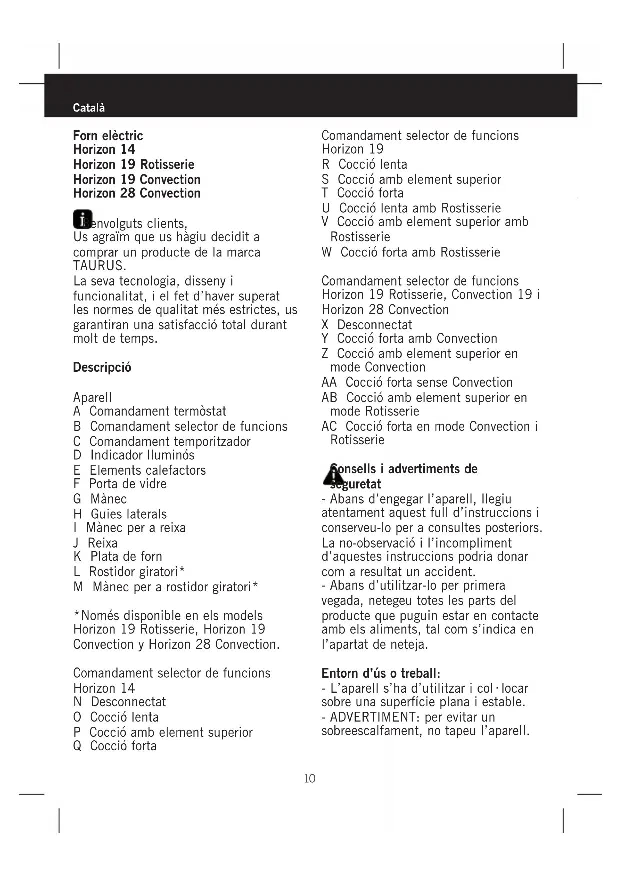 Horizon 19 Rotisserie - Forn TAURUS - Manual d'usuari gratuït