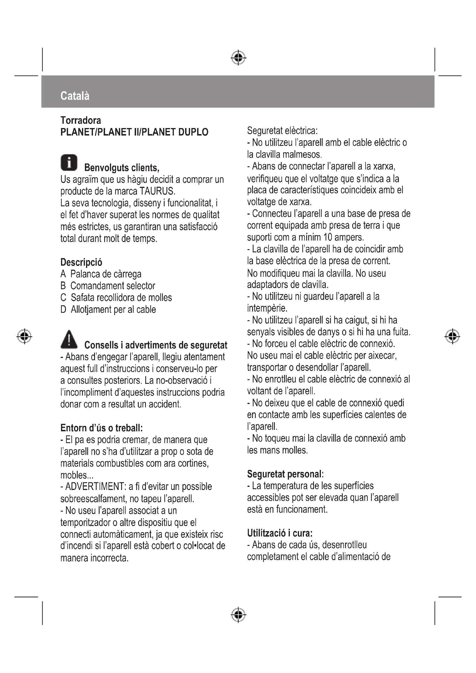 Benvolguts clients, Us agraïm que us hàgiu decidit a comprar un producte de la marca TAURUS. La seva tecnologia, disseny i funcionalitat, i el fet d’haver superat les normes de qualitat més estrictes, us garantiran una satisfacció total durant molt de temps. Descripció A Palanca de càrrega B Comandament selector C Safata recollidora de molles D Allotjament per al cable Consells i advertiments de seguretat - Abans d’engegar l’aparell, llegiu atentament aquest full d’instruccions i conserveu-lo per a consultes posteriors. La no-observació i l’incompliment d’aquestes instruccions podria donar com a resultat un accident. Entorn d’ús o treball: - El pa es podria cremar, de manera que l’aparell no s’ha d’utilitzar a prop o sota de materials combustibles com ara cortines, mobles... - ADVERTIMENT: a d’evitar un possible sobreescalfament, no tapeu l’aparell. - No useu l’aparell associat a un temporitzador o altre dispositiu que el connecti automàticament, ja que existeix risc d’incendi si l’aparell està cobert o col•locat de manera incorrecta. Seguretat elèctrica: - No utilitzeu l’aparell amb el cable elèctric o la clavilla malmesos. - Abans de connectar l’aparell a la xarxa, veriqueu que el voltatge que s’indica a la placa de característiques coincideix amb el voltatge de xarxa. - Connecteu l’aparell a una base de presa de corrent equipada amb presa de terra i que suporti com a mínim 10 ampers. - La clavilla de l’aparell ha de coincidir amb la base elèctrica de la presa de corrent. No modiqueu mai la clavilla. No useu adaptadors de clavilla. - No utilitzeu ni guardeu l’aparell a la intempèrie. - No utilitzeu l’aparell si ha caigut, si hi ha senyals visibles de danys o si hi ha una fuita. - No forceu el cable elèctric de connexió. No useu mai el cable elèctric per aixecar, transportar o desendollar l’aparell. - No enrotlleu el cable elèctric de connexió al voltant de l’aparell. - No deixeu que el cable de connexió quedi en contacte amb les superfícies calentes de l’aparell. - No toqueu mai la clavilla de connexió amb les mans molles. Seguretat personal: - La temperatura de les superfícies accessibles pot ser elevada quan l’aparell està en funcionament. Utilització i cura: - Abans de cada ús, desenrotlleu completament el cable d’alimentació del’aparell. - No useu l’aparell si el dispositiu d’engegada/ aturada no funciona. - No moveu o desplaceu l’aparell mentre estigui en funcionament. - No capgireu l’aparell mentre està en ús o connectat a la xarxa. - Desendolleu l’aparell de la xarxa quan no l’utilitzeu i abans de netejar-lo. - Aquest aparell està pensat exclusivament per a ús domèstic, no professional o industrial. - Aquest aparell no és una joguina. Els nens han d’estar sota vigilància per assegurar que no juguin amb l’aparell. - Aquest aparell està pensat perquè l’utilitzin persones adultes. No permeteu que l’utilitzin persones no familiaritzades amb aquest tipus de producte, persones discapacitades o nens. - Deseu aquest aparell fora de l’abast dels nens i/o persones discapacitades. - No deseu l’aparell si encara està calent. - Una utilització inadequada o en desacord amb les instruccions d’ús suposa un perill i anul•la la garantia i la responsabilitat del fabricant. Instruccions d’ús Notes prèvies a l’ús: - Abans d’usar el producte per primer cop, és aconsellable utilitzar-lo sense pa. Ús: - Connecteu l’aparell a la xarxa elèctrica. - Introduïu la llesca o llesques de pa a l’aparell. - Seleccioneu el grau de torrada mitjançant el comandament selector. - Engegueu l’aparell fent lliscar el comandament carregador cap avall ns a sentir un clic. - La llesca o les llesques de pa se centraran automàticament per obtenir una torrada uniforme. - Per minimitzar la generació d’acrilamida durant el procés de torrat, no deixeu que el pa es torni de color marró fosc o negre. - Un cop transcorregut el temps de torrada seleccionat, l’aparell s’aturarà automàticament. Funció Cancel•lar: - Al col•locar el selector de torrada en la posició de parada, s’atura el cicle automàticament i s’expulsa el pa. El procés de torrat pot interrompre’s en qualsevol moment, posant el selector en aquesta posició. Un cop nalitzat l’ús de l’aparell: - Desendolleu l’aparell de la xarxa elèctrica. - Recolliu el cable i situeu-lo a l’allotjament. - Netegeu l’aparell. Allotjament per al cable - Aquest aparell disposa d’un allotjament per al cable de connexió a la xarxa que es troba situat a la part inferior. Neteja - Desendolleu l’aparell de la xarxa i deixeu-lo refredar abans de dur a terme qualsevol operació de neteja.- Netegeu l’aparell amb un drap humit impregnat amb unes gotes de detergent i després eixugueu-lo. - Per netejar l’aparell, no utilitzeu dissolvents ni productes amb un factor pH àcid o bàsic, com el lleixiu, ni productes abrasius. - No submergiu l’aparell en aigua ni en cap altre líquid, ni el poseu sota l’aixeta. - Es recomana netejar l’aparell regularment i retirar-ne les restes d’aliments. Safata recollidora de molles - L’aparell disposa d’una safata que permet recollir les molles de pa que puguin quedar a l’interior de l’aparell. - Extraieu la safata de l’aparell - Aboqueu el contingut de la safata. - Espolseu lleugerament l’aparell per eliminar totes les molles que puguin quedar a l’interior. - Torneu a col•locar la safata a l’aparell. Anomalies i reparació - En cas d’avaria, porteu l’aparell a un servei d’assistència tècnica autoritzat. No intenteu desmuntar-lo o reparar-lo perquè podria ser perillós. - Si la connexió a la xarxa està malmesa, cal substituir-la i actuar com en cas d’avaria. Ecologia i reciclabilitat del producte - Els materials que componen l’embalatge d’aquest electrodomèstic estan integrats en un sistema de recollida, classicació i reciclatge. Si us 