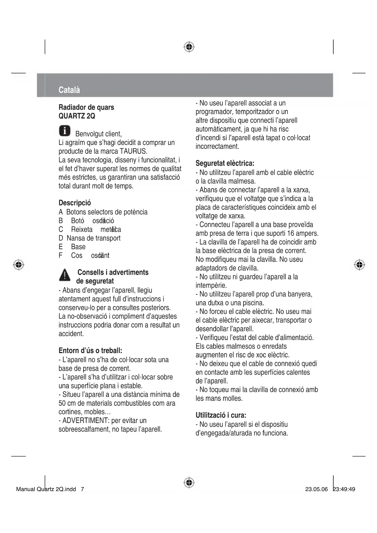 locat incorrectament. Seguretat elèctrica: - No utilitzeu l’aparell amb el cable elèctric o la clavilla malmesa. - Abans de connectar l’aparell a la xarxa, verifiqueu que el voltatge que s’indica a la placa de característiques coincideix amb el voltatge de xarxa. - Connecteu l’aparell a una base proveïda amb presa de terra i que suporti 16 ampers. - La clavilla de l’aparell ha de coincidir amb la base elèctrica de la presa de corrent. No modifiqueu mai la clavilla. No useu adaptadors de clavilla. - No utilitzeu ni guardeu l’aparell a la intempèrie. - No utilitzeu l’aparell prop d’una banyera, una dutxa o una piscina. - No forceu el cable elèctric. No useu mai el cable elèctric per aixecar, transportar o desendollar l’aparell. - Verifiqueu l’estat del cable d’alimentació. Els cables malmesos o enredats augmenten el risc de xoc elèctric. - No deixeu que el cable de connexió quedi en contacte amb les superfícies calentes de l’aparell. - No toqueu mai la clavilla de connexió amb les mans molles. Utilització i cura: - No useu l’aparell si el dispositiu d’engegada/aturada no funciona. Manual Quartz 2Q.indd 7Manual Quartz 2Q.indd 7 23.05.06 23:49:4923.05.06 23:49:49- Desendolleu l’aparell de la xarxa quan no l’utilitzeu i abans de netejar-lo. - Aquest aparell està pensat únicament per a ús domèstic, no per a ús professional o industrial. - Aquest aparell està pensat perquè l’utilitzin persones adultes. No permeteu que l’utilitzin persones no familiaritzades amb aquest tipus de producte, persones discapacitades o nens. - Guardeu aquest aparell fora de l’abast dels nens i/o persones discapacitades. - No utilitzeu l’aparell inclinat ni el capgireu. - No useu l’aparell per assecar peces de roba tèxtil de cap mena. - Una utilització inadequada o en desacord amb les instruccions d’ús suposa un perill i anul