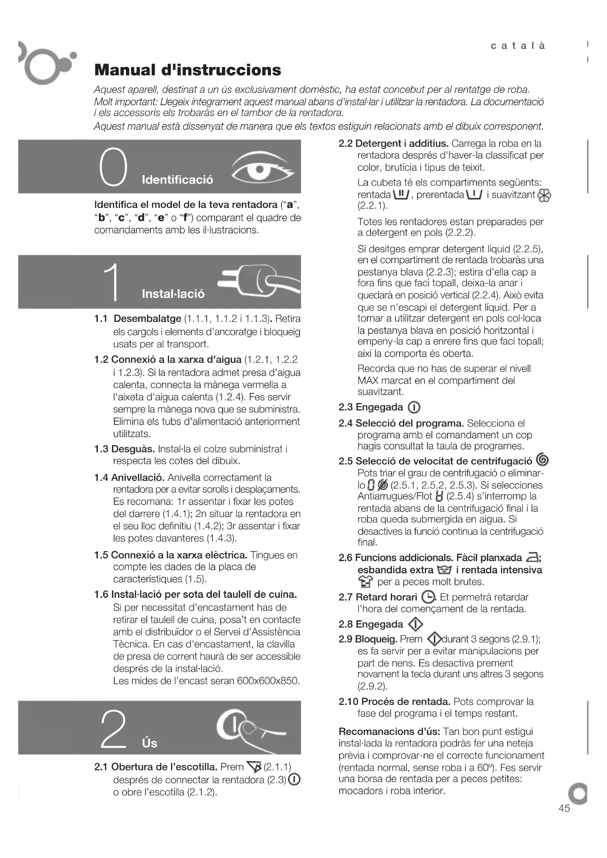 fase del programa i el temps restant. Recomanacions d'ús: Tan bon punt estigui instal·lada la rentadora podràs fer una neteja prèvia i comprovar-ne el correcte funcionament (rentada normal, sense roba i a 60º). Fes servir una borsa de rentada per a peces petites: mocadors i roba interior. Identificació Identifica el model de la teva rentadora (“a”,