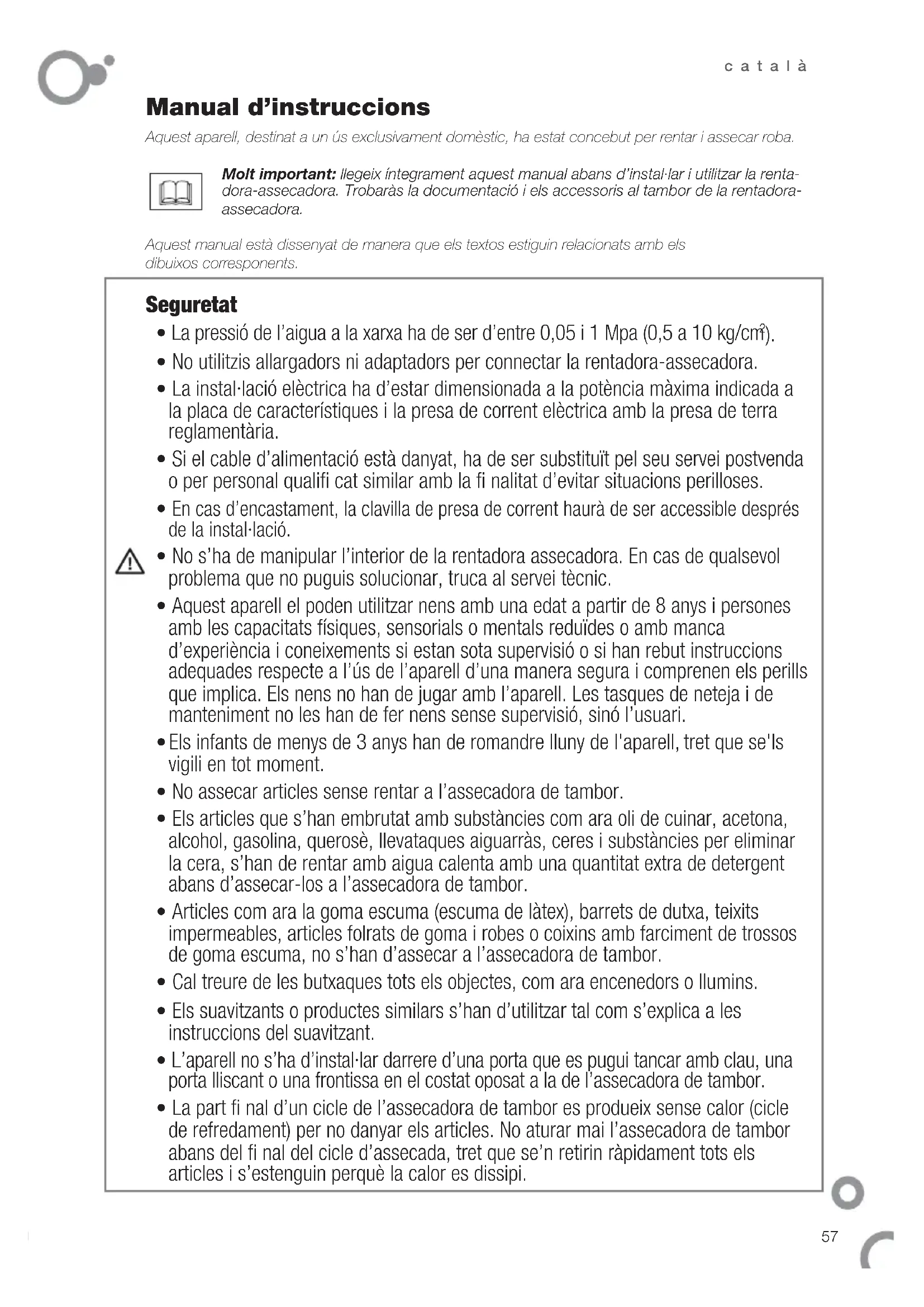 - La part fi nal d’un cicle de l’assecadora de tambor es produeix sense calor (cicle de refredament) per no danyar els articles. No aturar mai l’assecadora de tambor abans del fi nal del cicle d’assecada, tret que se’n retirin ràpidament tots els articles i s’estenguin perquè la calor es dissipi. Aquest aparell, destinat a un ús exclusivament domèstic, ha estat concebut per rentar i assecar roba. Molt important: llegeix íntegrament aquest manual abans d’instal·lar i utilitzar la renta- dora-assecadora. Trobaràs la documentació i els accessoris al tambor de la rentadora- assecadora. Aquest manual està dissenyat de manera que els textos estiguin relacionats amb els dibuixos corresponents. Seguretat58 català