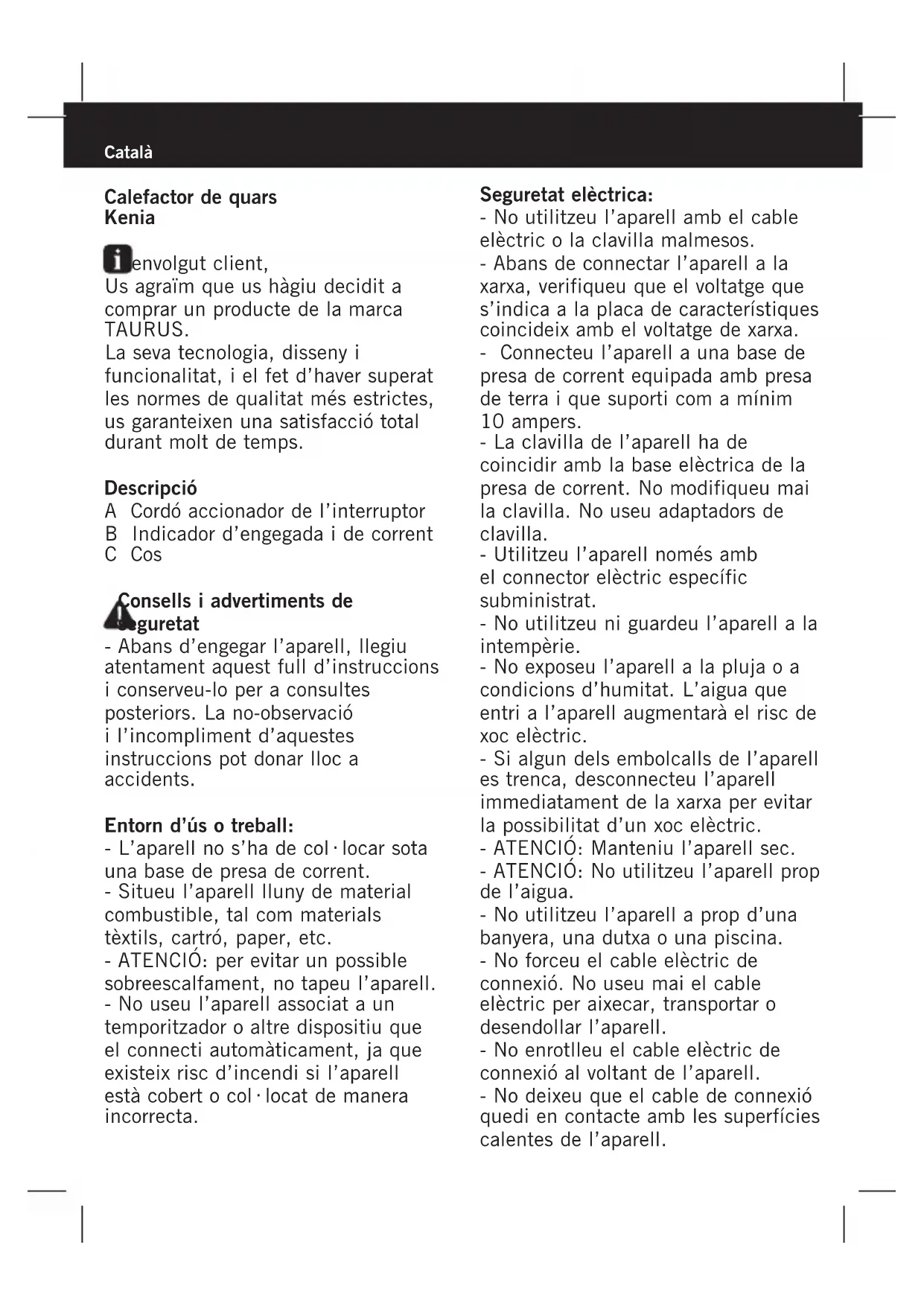- Abans d'engegar l'aparell, llegiu atentament aquest full d'instruccions i conserveu-lo per a consultes posteriors. La no-observació i l'incompliment d'aquestes instruccions pot donar lloc a accidents.