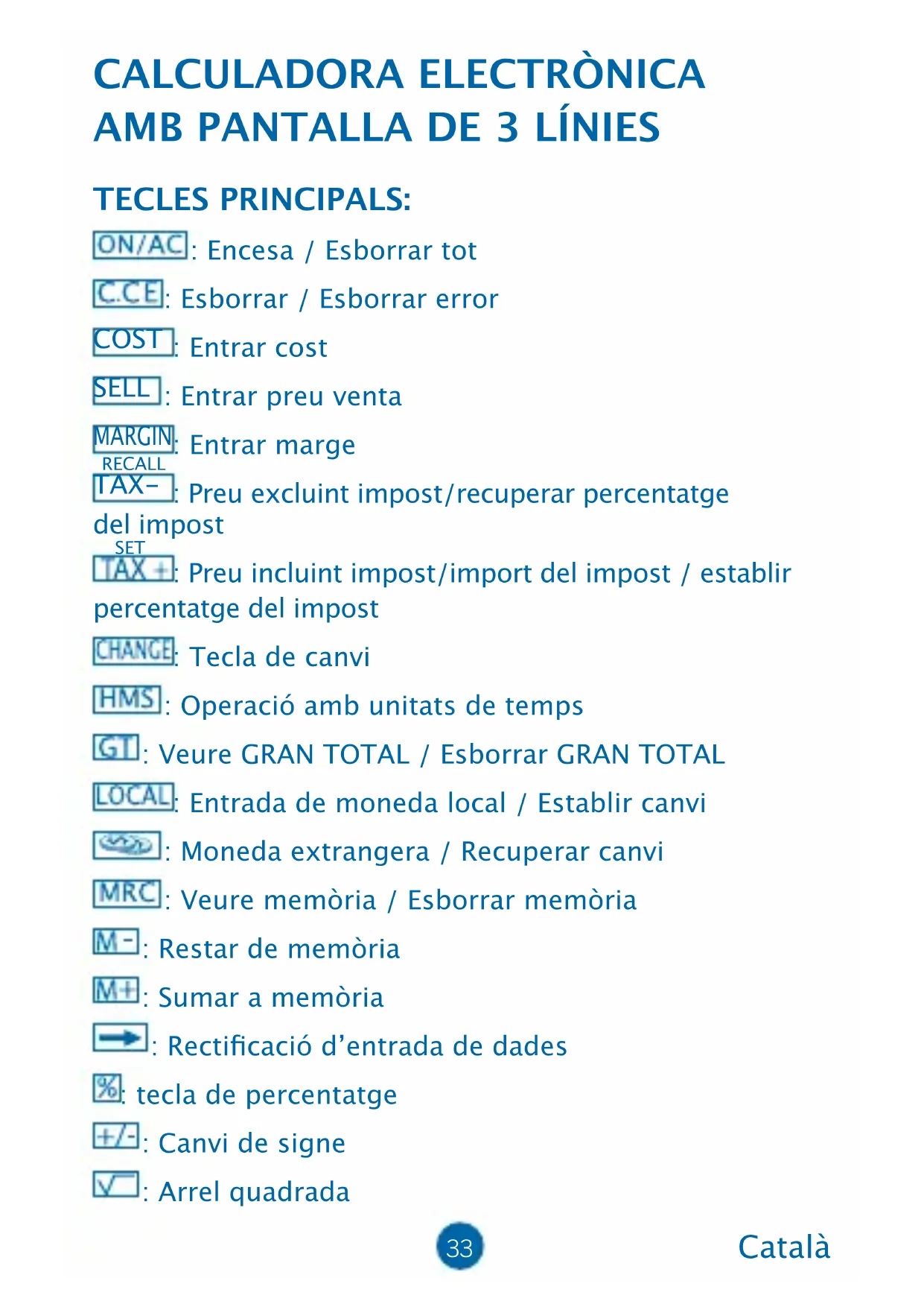 TECLES PRINCIPALS: : Encesa / Esborrar tot : Esborrar / Esborrar error COST : Entrar cost SELL : Entrar preu venta MARGIN : Entrar marge TAX- : Preu excluint impost/recuperar percentatge del impost : Preu incluint impost/import del impost / establir percentatge del impost : Tecla de canvi : Operació amb unitats de temps : Veure GRAN TOTAL / Esborrar GRAN TOTAL : Entrada de moneda local / Establir canvi : Moneda extrangera / Recuperar canvi : Veure memòria / Esborrar memòria : Restar de memòria : Sumar a memòria : Recticació d’entrada de dades : tecla de percentatge : Canvi de signe : Arrel quadrada RECALL SET34 DESCRIPCIÓ DELS SELECTORS: