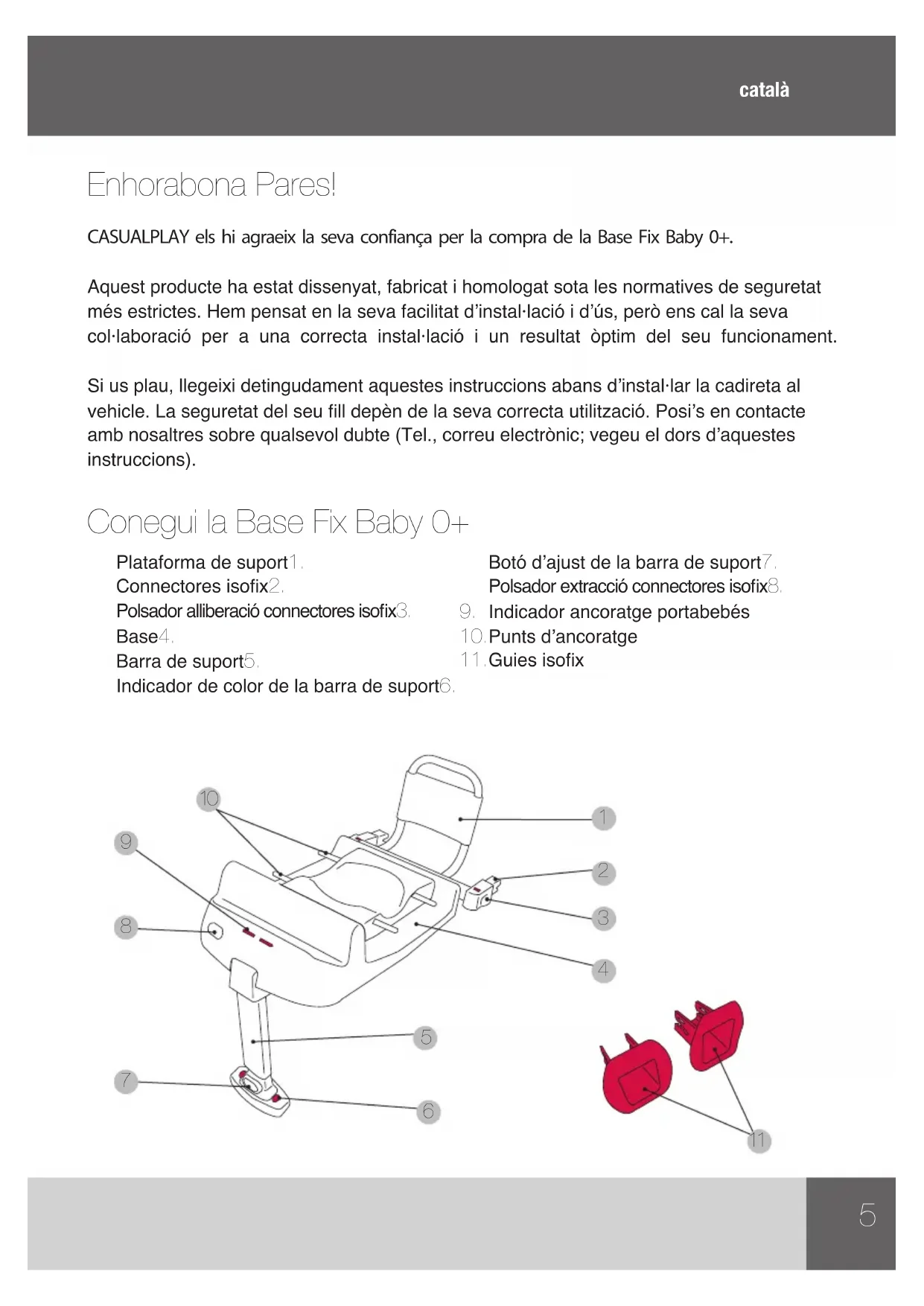 Enhorabona Pares! CASUALPLAY els hi agraeix la seva confiança per la compra de la Base Fix Baby 0+. Aquest producte ha estat dissenyat, fabricat i homologat sota les normatives de seguretat més estrictes. Hem pensat en la seva facilitat d’instal·lació i d’ús, però ens cal la seva col·laboració per a una correcta instal·lació i un resultat òptim del seu funcionament. Si us plau, llegeixi detingudament aquestes instruccions abans d’instal·lar la cadireta al vehicle. La seguretat del seu ll depèn de la seva correcta utilització. Posi’s en contacte amb nosaltres sobre qualsevol dubte (Tel., correu electrònic; vegeu el dors d’aquestes instruccions). Conegui la Base Fix Baby 0+ Plataforma de suport1. Connectores isox2. Polsador alliberació connectores isox3. Base4. Barra de suport5. Indicador de color de la barra de suport6. Botó d’ajust de la barra de suport7. Polsador extracció connectores isox8. Indicador ancoratge portabebés9. Punts d’ancoratge10. Guies isox11.6 Atenció! LA Base x Baby Zero ÉS COMPATIBLE ÚNICAMENT AMB LA CADIRA D’AUTO Base Fix Baby 0+. Atenció! No instal·li mai la base en seients proveïts de AIRBAG frontal sense desconnectar-ho prèviament. Avís