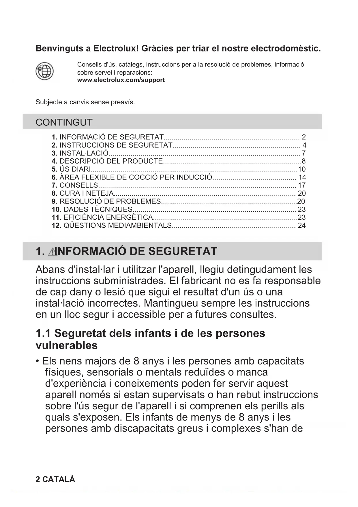 EIV85446 CA Manual d’usuari | Placa 2 NL Gebruiksaanwijzing | Kookplaat 25 FR Notice d'utilisation | Table de cuisson 48 DE Benutzerinformation | Kochfeld 72 PT Manual de instruções | Placa 96 ES Manual de instrucciones | Placa de cocción 119Benvinguts a Electrolux! Gràcies per triar el nostre electrodomèstic. Consells d'ús, catàlegs, instruccions per a la resolució de problemes, informaciósobre servei i reparacions:www.electrolux.com/supportSubjecte a canvis sense preavís. CONTINGUT