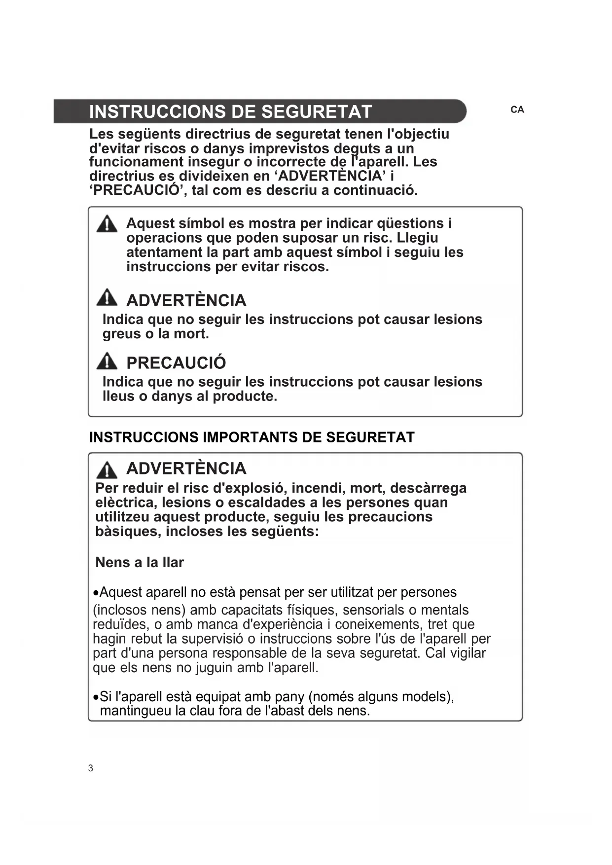 Aquest símbol es mostra per indicar qüestions i operacions que poden suposar un risc. Llegiu atentament la part amb aquest símbol i seguiu les instruccions per evitar riscos. ADVERTÈNCIA Indica que no seguir les instruccions pot causar lesions greus o la mort. PRECAUCIÓ Indica que no seguir les instruccions pot causar lesions lleus o danys al producte. ADVERTÈNCIA Per reduir el risc d'explosió, incendi, mort, descàrrega elèctrica, lesions o escaldades a les persones quan utilitzeu aquest producte, seguiu les precaucions bàsiques, incloses les següents: Nens a la llar (inclosos nens) amb capacitats físiques, sensorials o mentals reduïdes, o amb manca d'experiència i coneixements, tret que hagin rebut la supervisió o instruccions sobre l'ús de l'aparell per part d'una persona responsable de la seva seguretat. Cal vigilar que els nens no juguin amb l'aparell.
