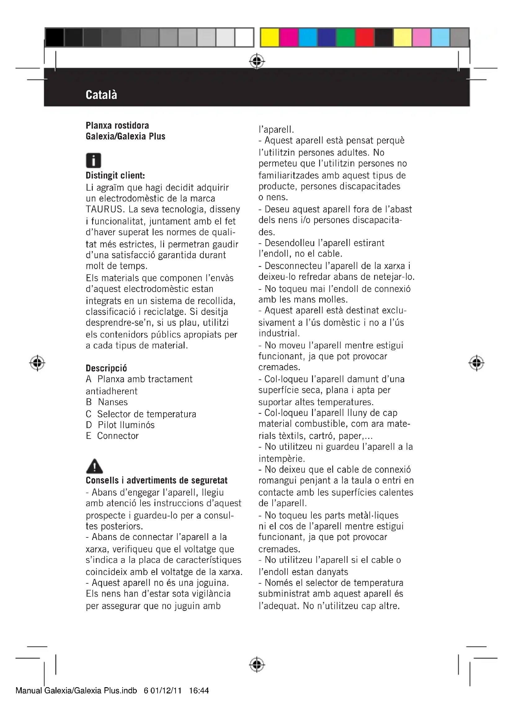 Descarrega les instruccions per al teu Plana de graella en format PDF gratuïtament! Trobeu el vostre manual Galexia Plus - TAURUS i torna a tenir el teu dispositiu electrònic a les mans. En aquesta pàgina es publiquen tots els documents necessaris per a l'ús del teu dispositiu. Galexia Plus de la marca TAURUS.