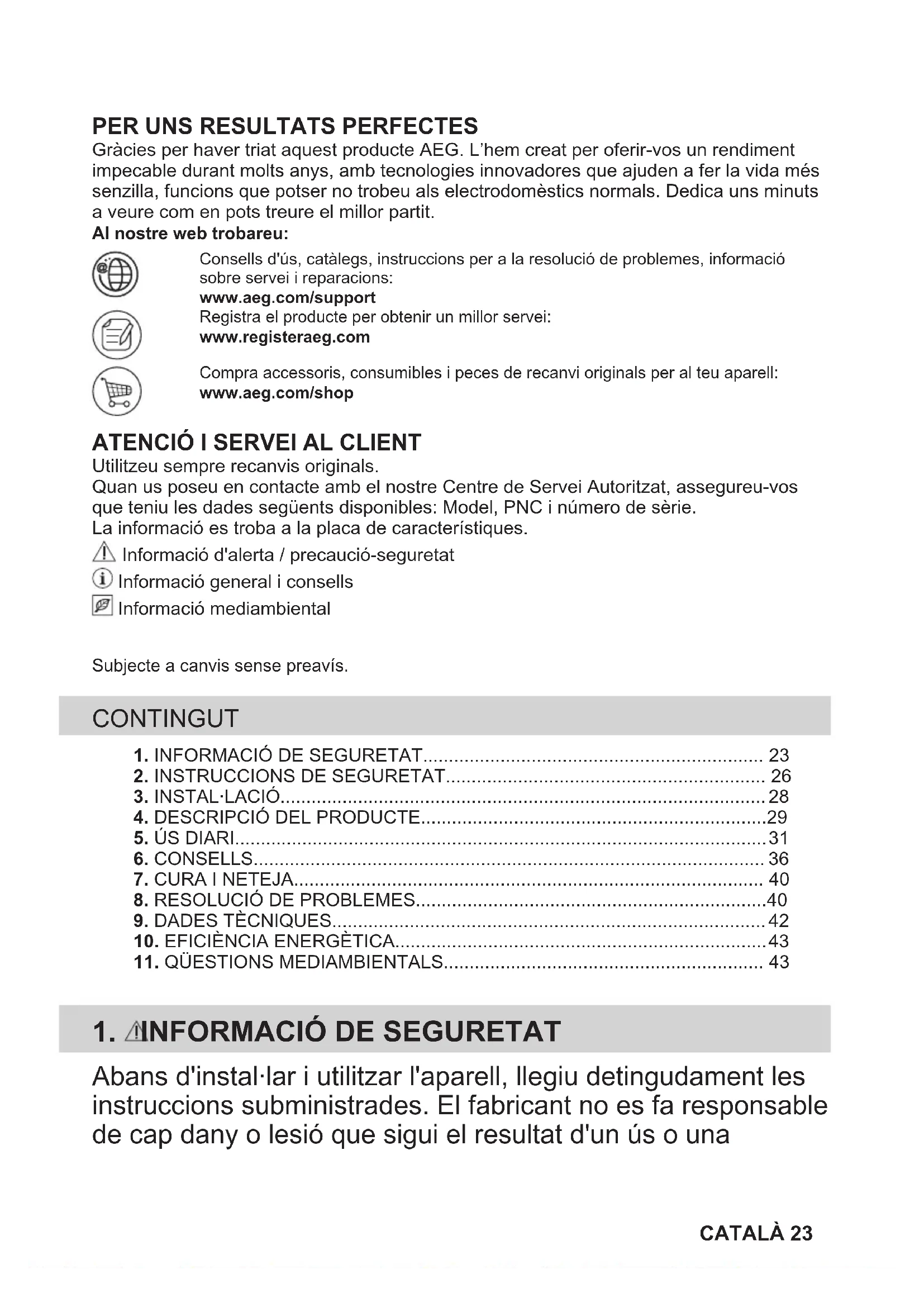 Gràcies per haver triat aquest producte AEG. L’hem creat per oferir-vos un rendimentimpecable durant molts anys, amb tecnologies innovadores que ajuden a fer la vida méssenzilla, funcions que potser no trobeu als electrodomèstics normals. Dedica uns minutsa veure com en pots treure el millor partit.Al nostre web trobareu:Consells d'ús, catàlegs, instruccions per a la resolució de problemes, informaciósobre servei i reparacions:www.aeg.com/supportRegistra el producte per obtenir un millor servei:www.registeraeg.comCompra accessoris, consumibles i peces de recanvi originals per al teu aparell:www.aeg.com/shop