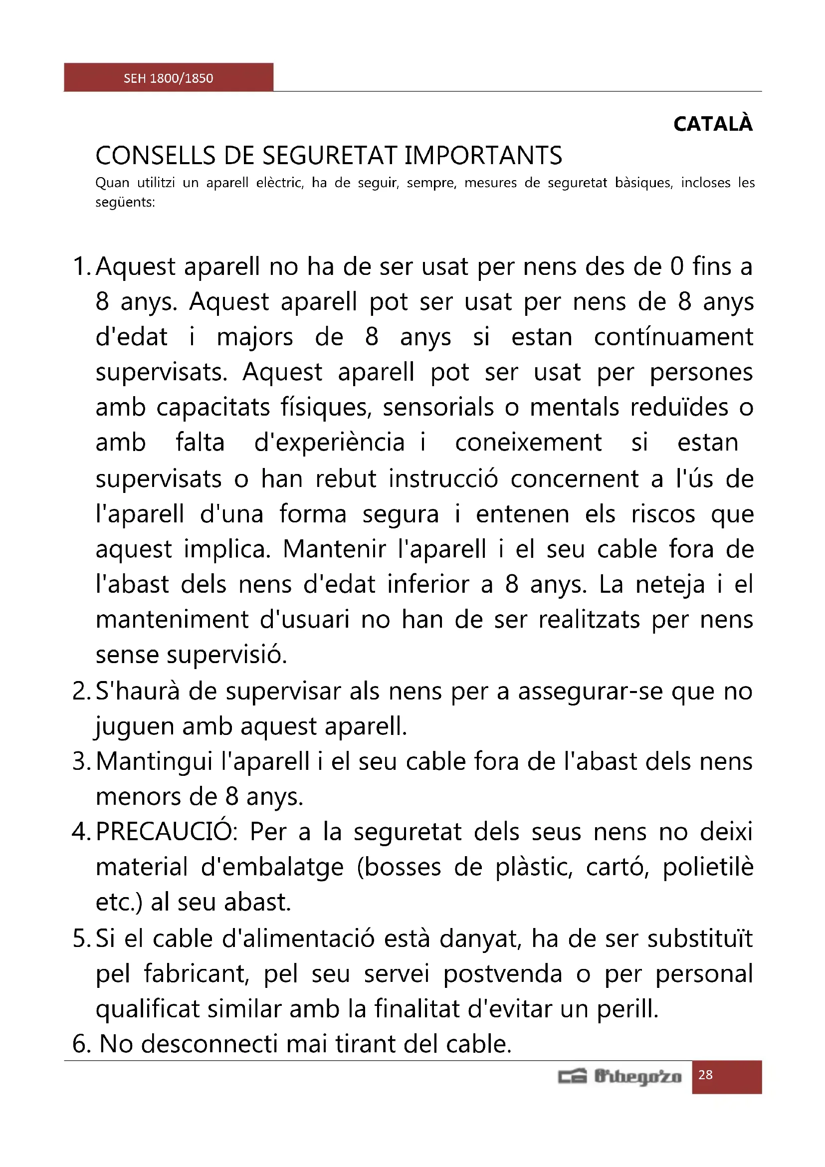 MANUAL D'USUARI SEH 1800 Orbegozo