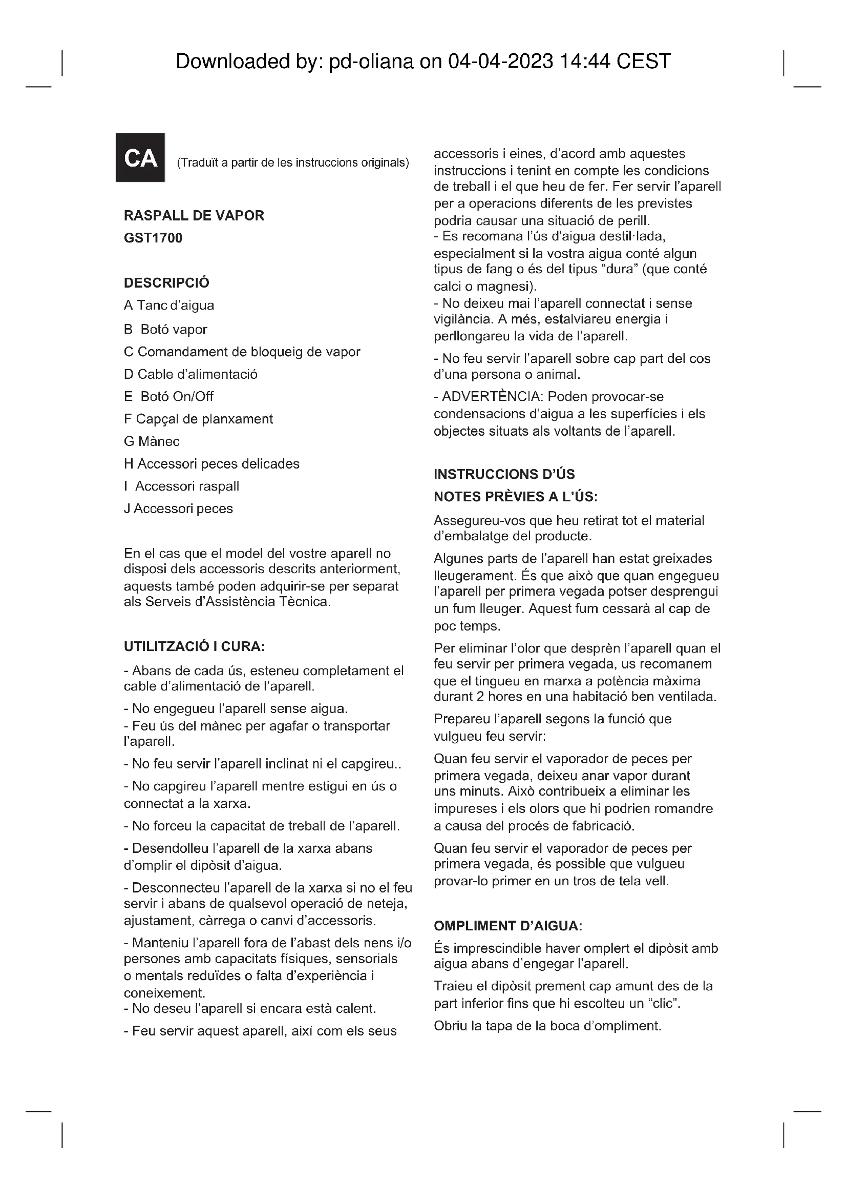Attendere che su spenga la spia rossa e premere il pulsante del vapore nché tutta l’acqua del serbatoio non sia stata vaporizzata. Rilasciare il pulsante del vapore, scollegare dalla presa di corrente e lasciar raffreddare 30 minuti. - Ripetere la procedura tutte le volte necessarie, nché non si ottenga una velocità normale del vapore: in genere da 2 a 3 volte. Ogni volta che si ripete un ciclo, utilizzare una nuova soluzione di acqua. - Al termine della decalcicazione e prima di utilizzare nuovamente il prodotto eseguire un ciclo con acqua distillata attraverso l’unità. PULIZIA Scollegare la spina dalla rete elettrica e aspettare che l’apparecchio si raffreddi, prima di eseguirne la pulizia. Pulire l'unità elettrica e il connettore di rete con un panno umido e poi asciugarli. NON IMMERGERLI MAI IN ACQUA O IN QUALUNQUE ALTRO LIQUIDO. Pulire il gruppo elettrico con un panno umido, quindi asciugarlo. Per la pulizia non impiegare solventi o prodotti a pH acido o basico, come la candeggina, né prodotti abrasivi. Non immergere l’apparecchio in acqua o altri liquidi, né lavarlo con acqua corrente. Downloaded by: pd-oliana on 04-04-2023 14:44 CESTRASPALL DE VAPOR GST1700 DESCRIPCIÓ A Tanc d’aigua B Botó vapor C Comandament de bloqueig de vapor D Cable d’alimentació E Botó On/Off F Capçal de planxament G Mànec H Accessori peces delicades I Accessori raspall J Accessori peces En el cas que el model del vostre aparell no disposi dels accessoris descrits anteriorment, aquests també poden adquirir-se per separat als Serveis d’Assistència Tècnica. UTILITZACIÓ I CURA: - Abans de cada ús, esteneu completament el cable d’alimentació de l’aparell. - No engegueu l’aparell sense aigua. - Feu ús del mànec per agafar o transportar l’aparell. - No feu servir l’aparell inclinat ni el capgireu.. - No capgireu l’aparell mentre estigui en ús o connectat a la xarxa. - No forceu la capacitat de treball de l’aparell. - Desendolleu l’aparell de la xarxa abans d’omplir el dipòsit d’aigua. - Desconnecteu l’aparell de la xarxa si no el feu servir i abans de qualsevol operació de neteja, ajustament, càrrega o canvi d’accessoris. - Manteniu l’aparell fora de l’abast dels nens i/o persones amb capacitats físiques, sensorials o mentals reduïdes o falta d’experiència i coneixement. - No deseu l’aparell si encara està calent. - Feu servir aquest aparell, així com els seus accessoris i eines, d’acord amb aquestes instruccions i tenint en compte les condicions de treball i el que heu de fer. Fer servir l’aparell per a operacions diferents de les previstes podria causar una situació de perill. - Es recomana l’ús d'aigua destil·lada, especialment si la vostra aigua conté algun tipus de fang o és del tipus “dura” (que conté calci o magnesi). - No deixeu mai l’aparell connectat i sense vigilància. A més, estalviareu energia i perllongareu la vida de l’aparell. - No feu servir l’aparell sobre cap part del cos d’una persona o animal. - ADVERTÈNCIA: Poden provocar-se condensacions d’aigua a les superfícies i els objectes situats als voltants de l’aparell.