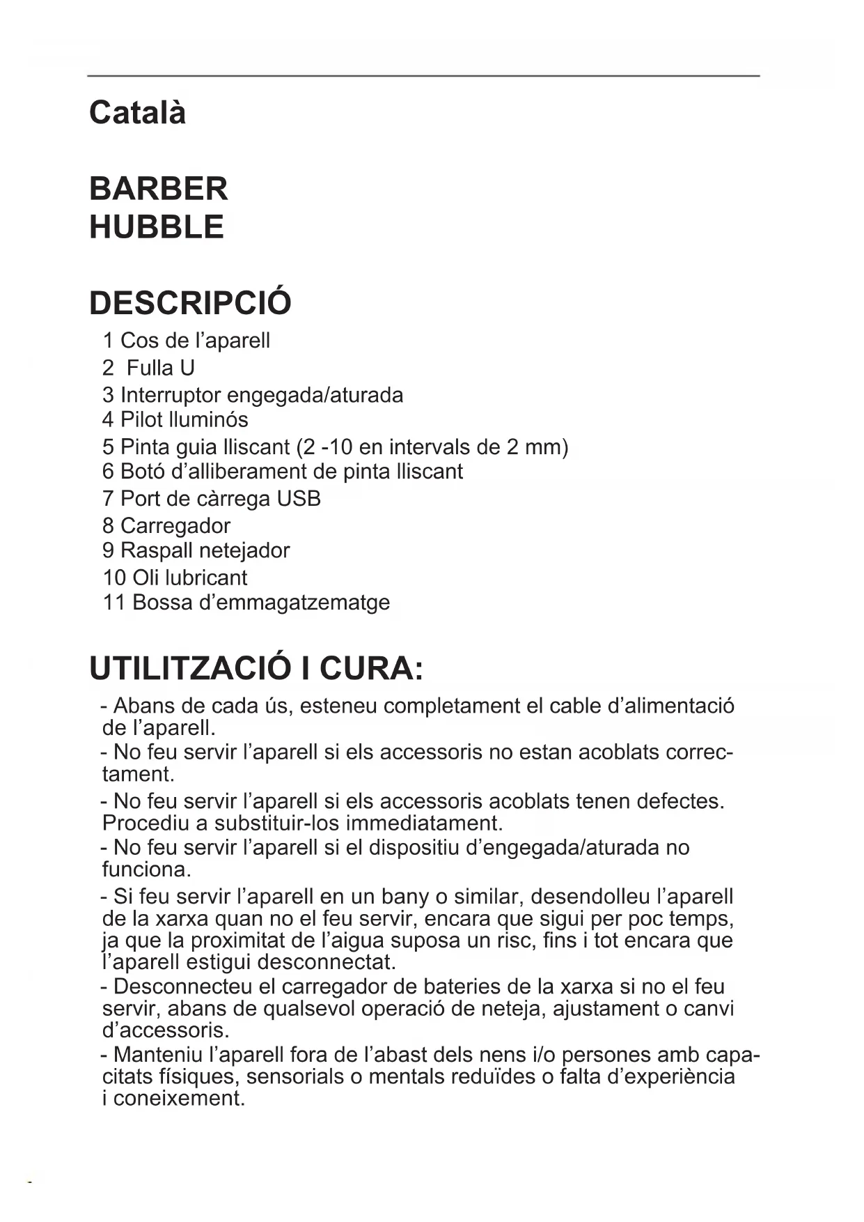 - Advertència: Les bateries noves no venen amb càrrega comple- ta i s’han de carregar al màxim abans de fer servir l’aparell per primera vegada. - Carregueu la bateria a temperatura ambient entre 4 i 40 ºC. - Endolleu el connector del carregador al port de càrrega USB de l’aparell (7), situada a la part inferior de l’aparell. - Endolleu el cable d’alimentació (8) a la xarxa elèctrica. - Mentre la bateria s’estigui carregant, hi parpellejarà el pilot(4) que indica que el carregador està carregant la bateria. - El temps necessari per a una càrrega completa és de 100 minuts aproximadament. - Quan la bateria està carregada per complet, la llum blava de l’indicador de càrrega (4) es torna xa. - Un cop nalitzada la càrrega, desendolleu el carregador de la xarxa elèctrica. - Quan l’aparell s’estigui quedant baix de bateria, el pilot lluminós (4) parpellejarà. Un cop comenci a parpellejar, connecteu l’aparell a la xarxa elèctrica.INSTRUCCIONS D’ÚS NOTES PRÈVIES A L’ÚS: - Assegureu-vos que heu retirat tot el material d’embalatge del producte. - Abans de fer servir el producte per primera vegada, és important fer una càrrega completa de les bateries. INSERCIÓ D’UNA PINTA GUIA: - Agafeu la pinta guia pels dos costats i introduïu el capçal a les guies (Fig. 1) i prement sobre el botó d’alliberament de la pinta (Fig. 2), llisqueu cap avall ns que s’hi acobli. - Feu servir el selector de mida de la pinta per ajustar l’altura del tall. - Per treure la pinta guia (5), manteniu premut el botó d’alliberament de la pinta (6) i estireu cap amunt. FULLA U (2) - Ideal per a retallar la barba, el bigoti i les patilles. - Es pot fer servir amb la pinta guia o sense, en funció de la longitud de tall desitjada. ÚS: - L’aparell es pot fer servir connectat a la xarxa o a les bateries. - Si voleu fer servir l’aparell connectat a la xarxa, esteneu completa- ment el cable abans d'endollar. - Connecteu l’aparell a la xarxa elèctrica. - Seleccioneu la mida de tall desitjada fent servir la pinta guia ade- quada amb la longitud desitjada. PER RETALLAR LA BARBA: - Feu servir la pinta guia (5) segons la mesura que desitgeu. - Talleu els cabells movent l’aparell en la direcció contrària a la del creixement natural. - Assegureu-vos sempre que les pues de la pinta guia apuntin a la direcció en què es mou l’aparell. - Eviteu que la pinta s’encalli amb els cabells. Traieu-la i netegeu-la de tant en tant. UN COP FINALITZAT L’ÚS DE L’APARELL: - Atureu l’aparell prement el botó engegada/aturada. - Desendolleu l’aparell de la xarxa elèctrica. - Netegeu l’aparell. - Perquè les fulles funcionin correctament, recomanem lubricar-les amb una goteta d’oli després de cada úsNETEJA - Desendolleu el carregador de la xarxa i deixeu-lo refredar abans de dur a terme qualsevol operació de neteja. - ADVERTÈNCIA: Separeu la part portàtil del cable d’alimentació abans de netejar-la amb aigua. - Desmunteu l'aparell seguint els passos següents: - Traieu la pinta guia (5) fent-ne servir el botó d’alliberament (6). - Agafeu l’aparell amb una mà i feu servir el polze per pressionar les fulles mentre subjecteu la part de plàstic amb el dit índex ns treure les fulles. (Fig.3). - Feu servir el raspall de neteja (9)per treure les restes de pèl dins de l’aparell i les fulles. - Netegeu l’aparell amb un drap humit impregnant amb unes gotes de detergent i després eixugueu-lo. - No feu servir dissolvents ni productes amb un factor pH àcid o bàsic com el lleixiu ni productes abrasius per netejar l’aparell. - No submergiu l’aparell en aigua ni en cap altre líquid. - Durant el procés de neteja s’ha d’anar molt en compte amb les fulles, ja que estan molt alades. - Si l’aparell no es manté en bon estat de neteja, la superfície pot degradar-se i afectar de manera inexorable la durada de la vida de l’aparell i provocar una situació perillosa. - Netegeu les fulles i la pinta guia amb el raspall de neteja. Traieu els pèls de les fulles i de dins de l’aparell amb el raspall. És impor- tant netejar les restes de pèl després de cada ús COM TREURE LES BATERIES DE L’INTERIOR DE L’APARELL: - Advertència: És important que les bateries estiguin descarregades completament abans de retirar-les de l’aparell. - Advertència: l’aparell ha d’estar desconnectat de l’alimentació quan se’n treguin les bateries - Per treure les bateries, un cop nalitzada la vida de l’aparell, pro- cediu de la manera següent: - Obriu la carcassa superior de l’aparell i traieu prèviament amb l’ajuda d’un tornavís els cargols de xació. (Fig. 4) - Identiqueu la bateria i talleu-ne els cables (Vermell i Negre). Per evitar riscos de curtcircuit amb la possible càrrega residual de la bateria, talleu en primer lloc el cable Vermell i protegiu-ne la part conductora amb cinta aïllant. Després, talleu el cable Negre de la mateixa manera. (Fig. 5) - Traieu amb compte la bateria del seu allotjament.Nederlands BAARDTRIMMER HUBBLE BESCHRIJVING 1 Romp van het apparaat 2 Mes U 3 Aan/uit schakelaar 4 Indicatorlampje 5 Glijdende geleidekam (2 -10 op intervallen van 2 mm) 6 Knop voor het loskoppelen van de glijdende kam 7 USB laadpoort 8 Oplader 9 Reinigingsborsteltje 10 Smeerolie 11 Opbergtas GEBRUIK EN ONDERHOUD: - Rol voor gebruik de voedingskabel van het apparaat volledig af. - Gebruik het apparaat niet wanneer de accessoires niet correct aangesloten zijn. - Gebruik het apparaat niet als de aangekoppelde accessoires beschadigd zijn. Vervang ze onmiddellijk. - Gebruik het apparaat niet als de aan/uit knop niet werkt. - Trek in een badkamer of een vergelijkbare ruimte de stekker uit het stopcontact als u het apparaat niet gebruikt, ook al is het maar voor korte tijd, aangezien de aanwezigheid van water een risico vormt, zelfs wanneer het apparaat uitgeschakeld is. - Trek de stekker van de batterijlader uit het stopcontact wanneer u hem niet gebr