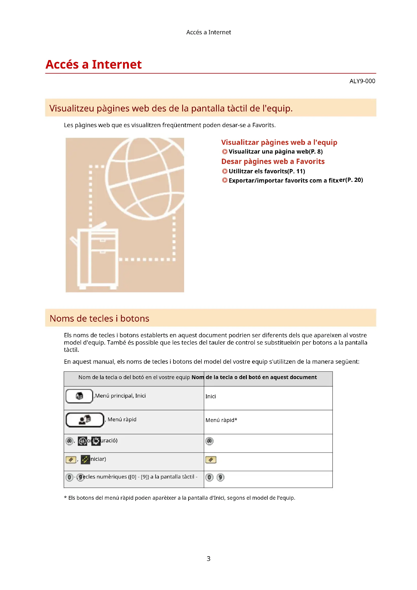 - Opcions de pantalla manual Accés a Internet 2Accés a Internet ALY9-000 Visualitzeu pàgines web des de la pantalla tàctil de l'equip. Les pàgines web que es visualitzen freqüentment poden desar-se a Favorits. Visualitzar pàgines web a l'equip Visualitzar una pàgina web(P . 8) Desar pàgines web a Favorits Utilitzar els favorits(P . 11) Exportar/importar favorits com a tx er(P. 20) Noms de tecles i botons Els noms de tecles i botons establerts en aquest document podrien ser difer ents dels que apareixen al vostre model d'equip. També és possible que les tecles del tauler de control se substitueixin per botons a la pantalla tàctil. En aquest manual, els noms de tecles i botons del model del vostre equip s'utilitzen de la manera següent: Nom de la tecla o del botó en el vostre equip Nom de la tecla o del botó en aquest document,Menú principal, IniciInici, Menú ràpidMenú ràpid*, , (Conguració), (Reiniciar)- , Tecles numèriques ([0] - [9]) a la pantalla tàctil -* Els botons del menú ràpid poden aparèixer a la pantalla d'Inici, segons el model de l'equip. Accés a Internet 3Pantalles utilitzades en aquest manual Depenent del model i l'entorn, la pantalla pot diferir de la pantalla tàctil que es descriu en aquest manual. Models compatibles Les icones a continuació indiquen informació que es limita a alguns models compatibles. Pot ser que alguns equips no estiguin disponibles segons el vostre país o regió. Models imageFORCE Models imageRUNNER ADVANCE / imageRUNNER ADVANCE DX NOTA Quan no es mostren les icones anteriors, s'admeten tots els models. Accés a Internet 4Informació del producte ALY9-001 Aquest pr oducte s'utilitza principalment en aplicacions web MEAP. És possible que no pugui mostrar llocs web generals. Aquest producte admet les versions i els llenguatges d'etiquetatge següents: Llenguatge d'etiquetatge Versió HTML HTML Living Standard p. 60
