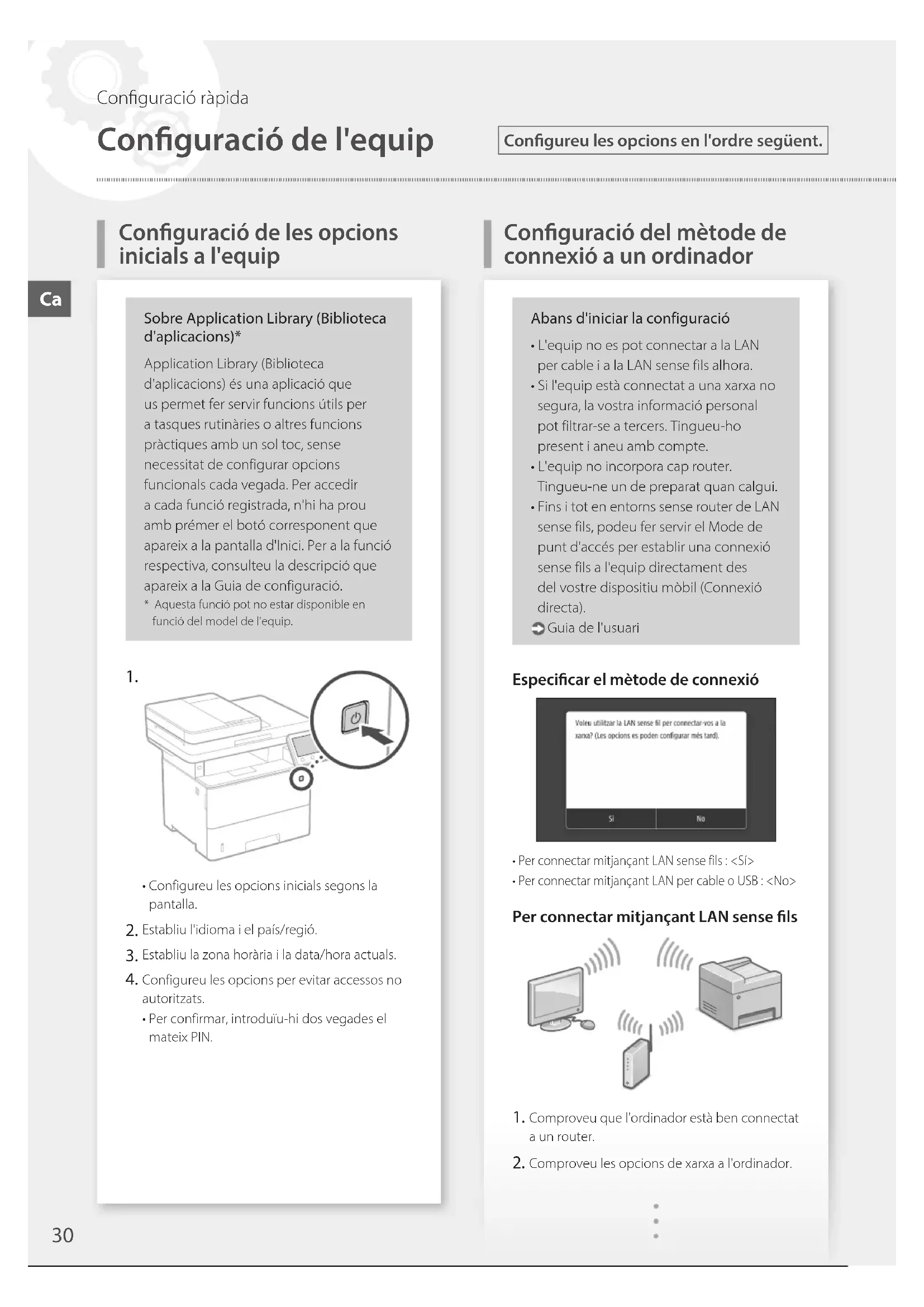 - Configureu les opcions inicials segons la pantalla. Establiu l'idioma i el país/regió. Establiu la zona horària i la data/hora actuals. Configureu les opcions per evitar accessos no autoritzats.• Per confirmar, introduïu-hi dos vegades el mateix PIN.Abans d'iniciar la configuració• L'equip no es pot connectar a la LAN per cable i a la LAN sense fils alhora.• Si l'equip està connectat a una xarxa no segura, la vostra informació personal pot filtrar-se a tercers. Tingueu-ho present i aneu amb compte.• L'equip no incorpora cap router. Tingueu-ne un de preparat quan calgui.• Fins i tot en entorns sense router de LAN sense fils, podeu fer servir el Mode de punt d'accés per establir una connexió sense fils a l'equip directament des del vostre dispositiu mòbil (Connexió directa). Guia de l'usuariEspecicar el mètode de connexió• Per connectar mitjançant LAN sense fils : <Sí>• Per connectar mitjançant LAN per cable o USB : <No>Per connectar mitjançant LAN sense ls Comproveu que l'ordinador està ben connectat a un router. Comproveu les opcions de xarxa a l'ordinador.