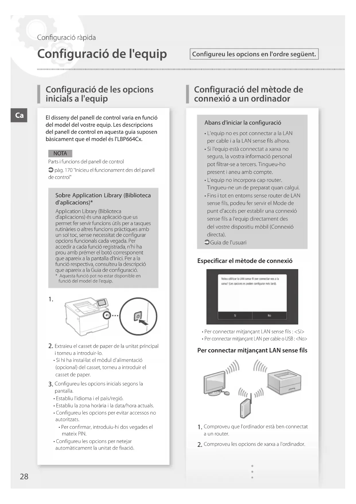 Si la pantalla no es veu bé, torneu a introduir elCD-ROM/DVD-ROMobusqueu"D:\MInst.exe"alaplataformaWindows(Aquestadescripció suposa que el nom de la unitat de CD-ROM/DVD-ROMés"D:").Per connectar mitjançant USB•L'equipnoincorporacapcableUSB.Tingueu-neun de preparat quan calgui.•ComproveuqueelcableUSBquefeu servir té la marca següent.•NoconnecteuelcableUSBabansd'instal·larelcontrolador. Si ho heu fet, desconnecteu el cable USB de l'ordinador, tanqueu el quadre de diàleg i apliqueu el procediment següent a partir del pas 1. Instal·leuelcontroladorielsoftware.pàg.30"Instal·laciódelsoftware"•Quanapareguilapantallaperconnectarelcable USB a l'equip, retireu la tapa que cobreix el port USB.Ja heu acabat amb la configuració de les opcions inicials. Configuració de l'equip Conguració ràpida Ca31Ordenagailu batera konektatzeko metodoaren konguratzea Application Library-ri (Aplikazio- liburutegiari) buruz* ApplicationLibrary-k(Aplikazio-liburutegiak)ohikolanakegitekofuntzioerabilgarriak eta bestelako funtzioak botoi bakar bat sakatuz osatzeko aukera ematen du, aldi bakoitzean ezarpen funtzionalak osatu beharrik gabe. Erregistratutako funtzio bakoitza botoi egokia sakatuz soilik atzitu daiteke Hasierako pantailan. Funtzio bakoitza ezagutzeko, ikusi Ezarpen gidaliburuan jasotako deskribapena.* Makinaren modeloaren arabera, baliteke fax funtzioa eskuragarri ez egotea.