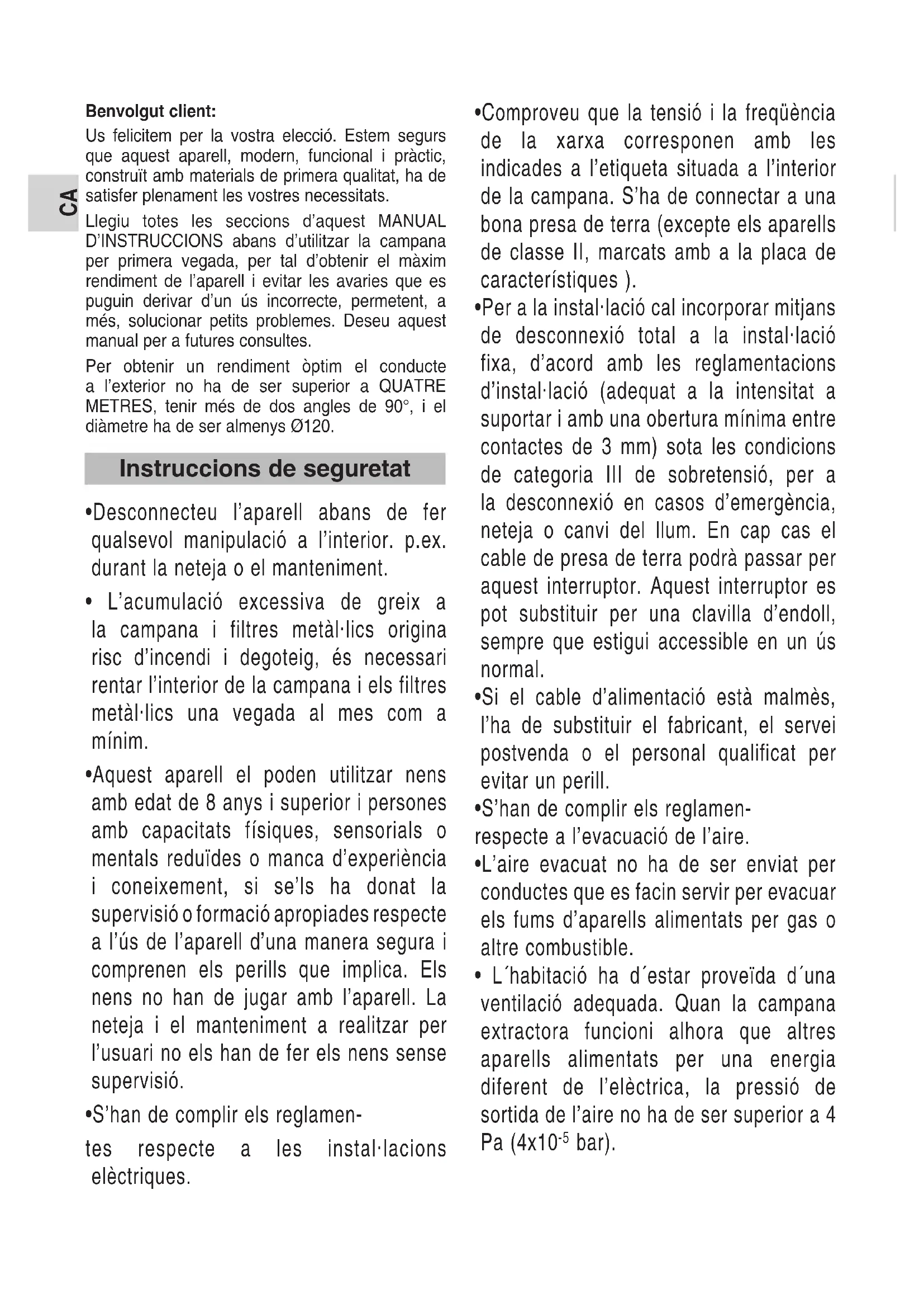 - L´habitació ha d´estar proveïda d´una ventilació adequada. Quan la campana extractora funcioni alhora que altres aparells alimentats per una energia diferent de l’elèctrica, la pressió de sortida de l’aire no ha de ser superior a 4 Pa (4x10