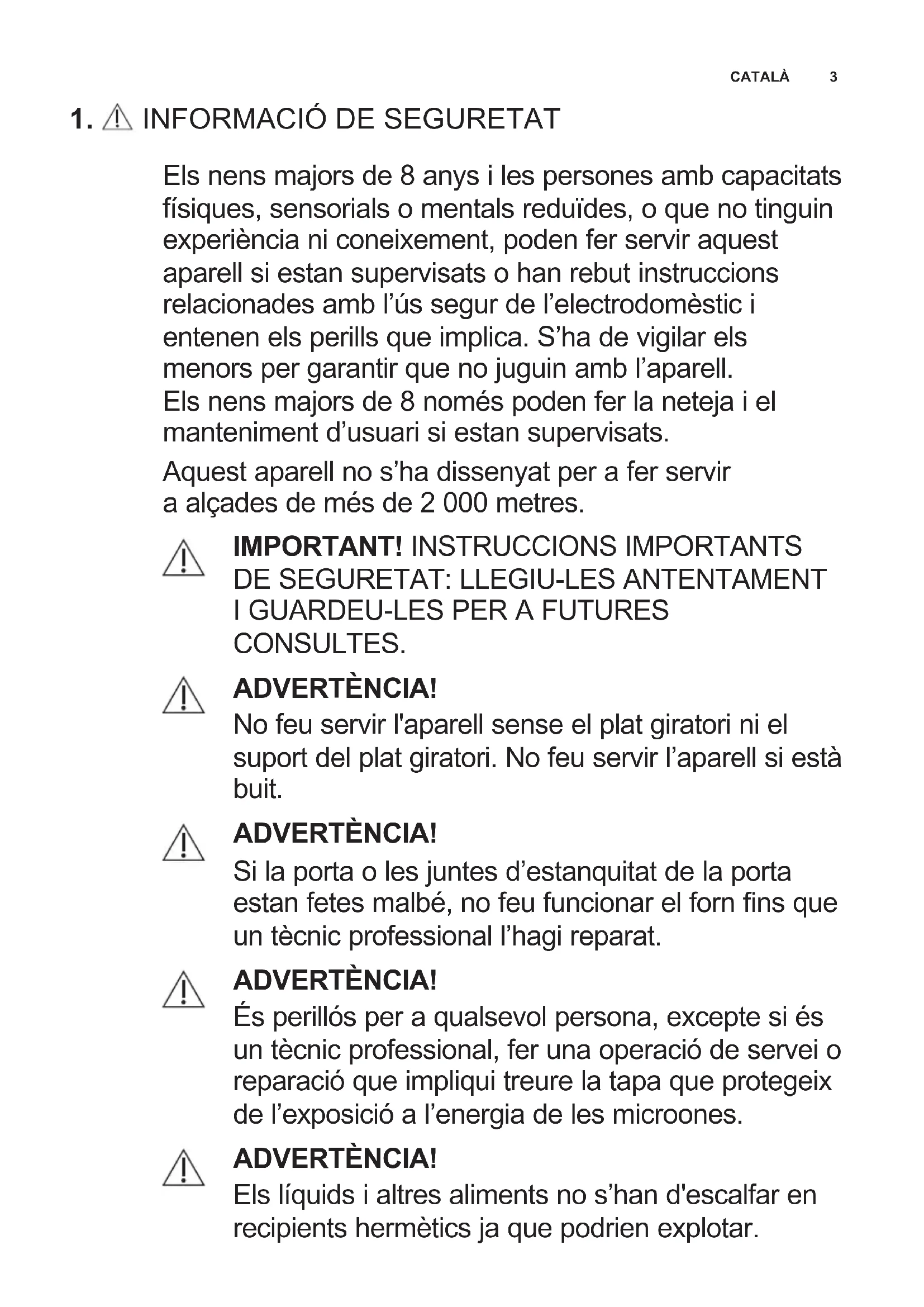 CONSULTES. ADVERTÈNCIA! No feu servir l'aparell sense el plat giratori ni el suport del plat giratori. No feu servir l’aparell si està buit. ADVERTÈNCIA! Si la porta o les juntes d’estanquitat de la porta estan fetes malbé, no feu funcionar el forn ns que un tècnic professional l’hagi reparat. ADVERTÈNCIA! És perillós per a qualsevol persona, excepte si és un tècnic professional, fer una operació de servei o reparació que impliqui treure la tapa que protegeix de l’exposició a l’energia de les microones. ADVERTÈNCIA! Els líquids i altres aliments no s’han d'escalfar en recipients hermètics ja que podrien explotar.