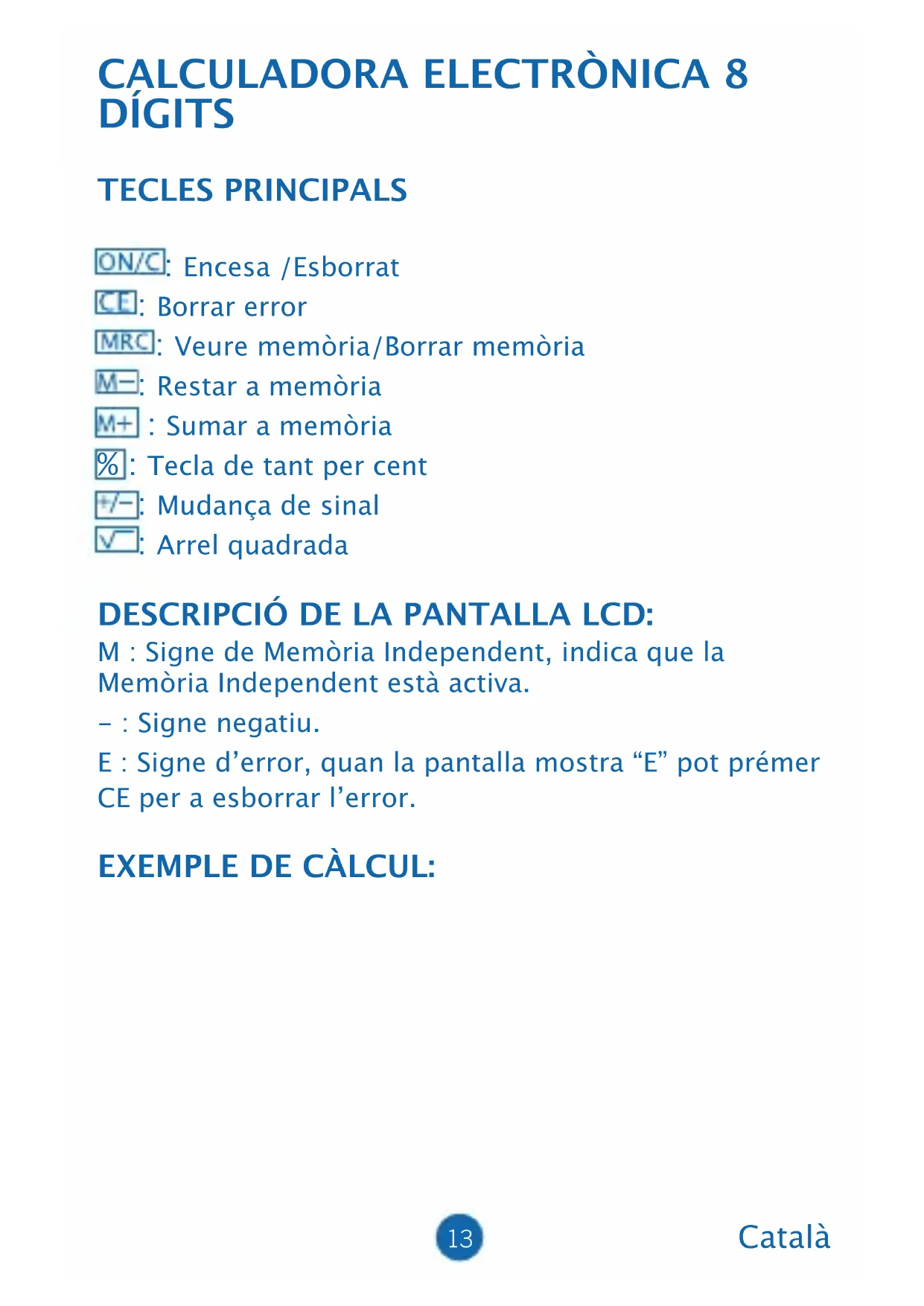 DÍGITS TECLES PRINCIPALS : Encesa /Esborrat : Borrar error : Veure memòria/Borrar memòria : Restar a memòria : Sumar a memòria % : Tecla de tant per cent : Mudança de sinal : Arrel quadrada DESCRIPCIÓ DE LA PANTALLA LCD: M : Signe de Memòria Independent, indica que la Memòria Independent està activa. - : Signe negatiu. E : Signe d’error, quan la pantalla mostra “E” pot prémer CE per a esborrar l’error. EXEMPLE DE CÀLCUL: Català14 ON/C 5+6M 32-6M+ 36+17M- MRC