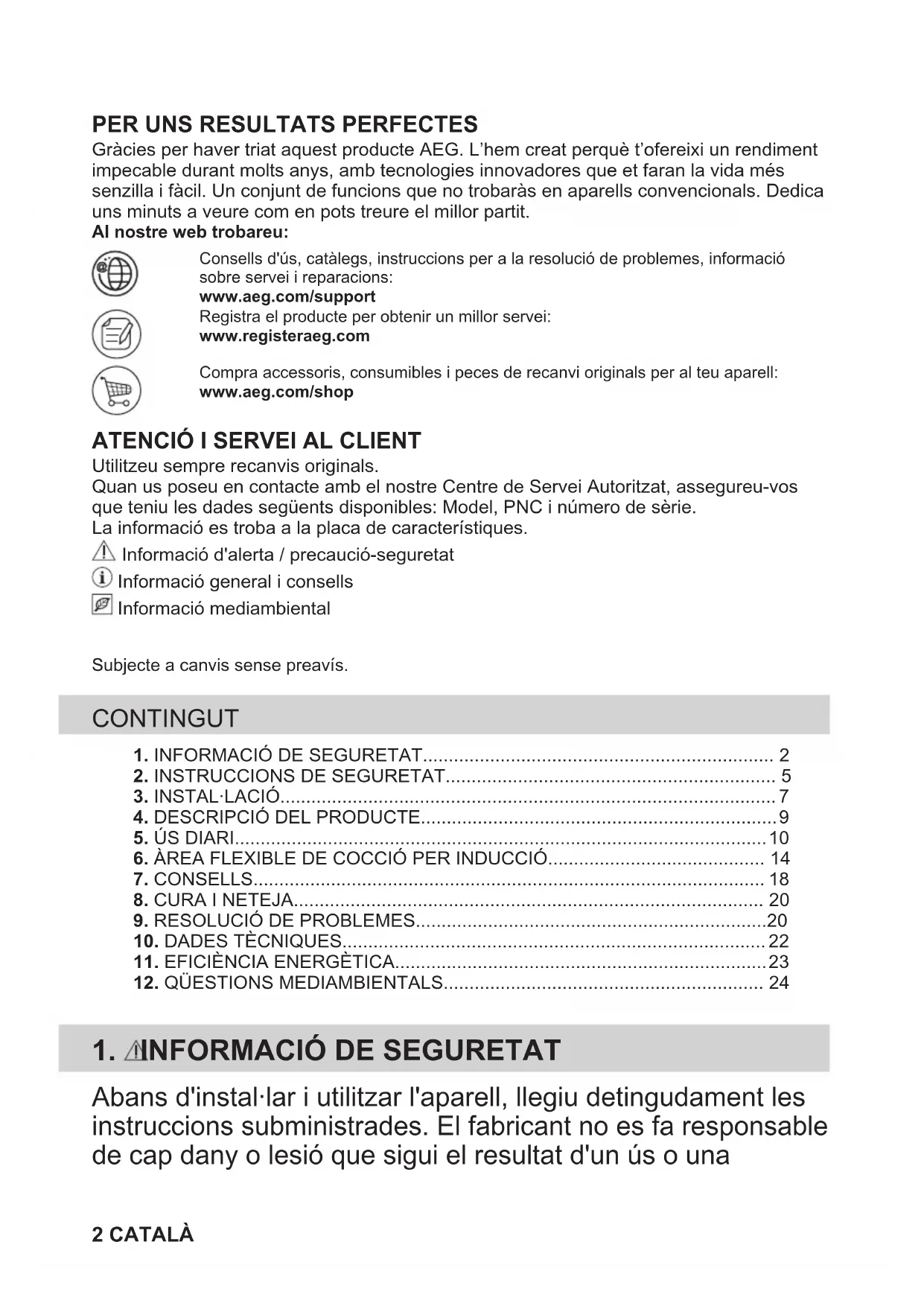 aeg.com/register IPE84571IB CA Manual d’usuari | Placa 2 DA Brugsanvisning | Kogesektion 25 NL Gebruiksaanwijzing | Kookplaat 47 EN User Manual | Hob 70 FI Käyttöohje | Keittotaso 92 FR Notice d'utilisation | Table de cuisson 114 DE Benutzerinformation | Kochfeld 138 PT Manual de instruções | Placa 162 ES Manual de instrucciones | Placa de cocción 185 SV Bruksanvisning | Inbyggnadshäll 208 aeg.com\registerPER UNS RESULTATS PERFECTES Gràcies per haver triat aquest producte AEG. L’hem creat perquè t’ofereixi un rendimentimpecable durant molts anys, amb tecnologies innovadores que et faran la vida méssenzilla i fàcil. Un conjunt de funcions que no trobaràs en aparells convencionals. Dedicauns minuts a veure com en pots treure el millor partit.Al nostre web trobareu:Consells d'ús, catàlegs, instruccions per a la resolució de problemes, informaciósobre servei i reparacions:www.aeg.com/supportRegistra el producte per obtenir un millor servei:www.registeraeg.comCompra accessoris, consumibles i peces de recanvi originals per al teu aparell:www.aeg.com/shop
