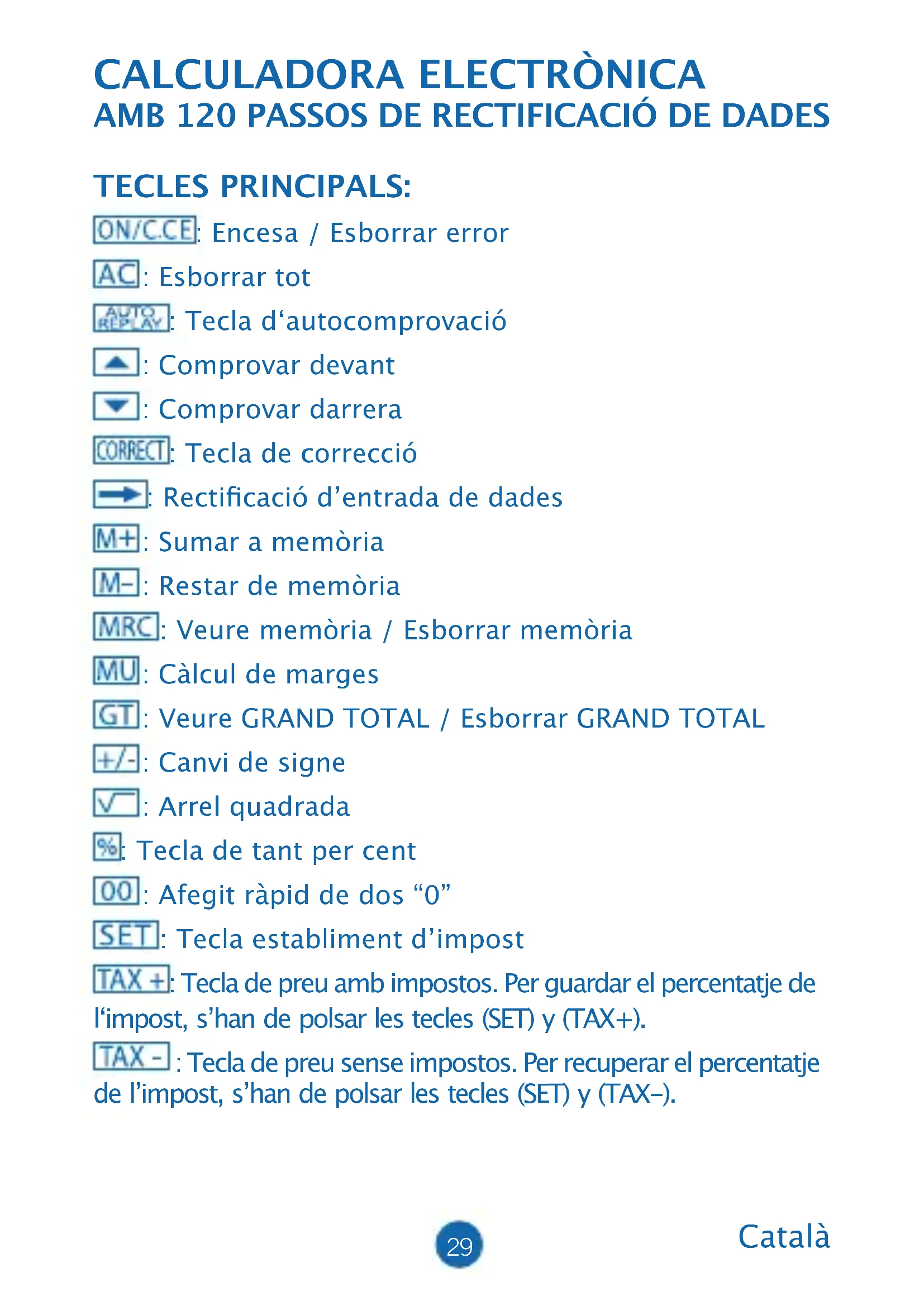 TECLES PRINCIPALS: : Encesa / Esborrar error : Esborrar tot : Tecla d‘autocomprovació : Comprovar devant : Comprovar darrera : Tecla de correcció : Recticació d’entrada de dades : Sumar a memòria : Restar de memòria : Veure memòria / Esborrar memòria : Càlcul de marges : Veure GRAND TOTAL / Esborrar GRAND TOTAL : Canvi de signe : Arrel quadrada : Tecla de tant per cent : Afegit ràpid de dos “0” : Tecla establiment d’impost : Tecla de preu amb impostos. Per guardar el percentatje de l‘impost, s’han de polsar les tecles (SET) y (TAX+). : Tecla de preu sense impostos. Per recuperar el percentatje de l’impost, s’han de polsar les tecles (SET) y (TAX-).30 DESCRIPCIÓ DELS SELECTORS: