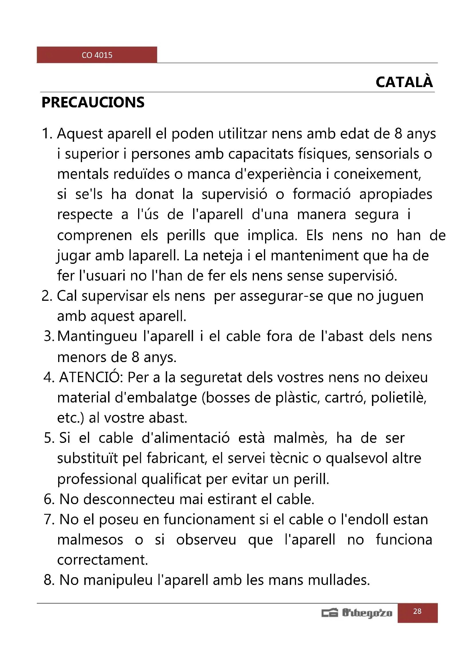 8. No manipuleu l'aparell amb les mans mullades.CO 4015