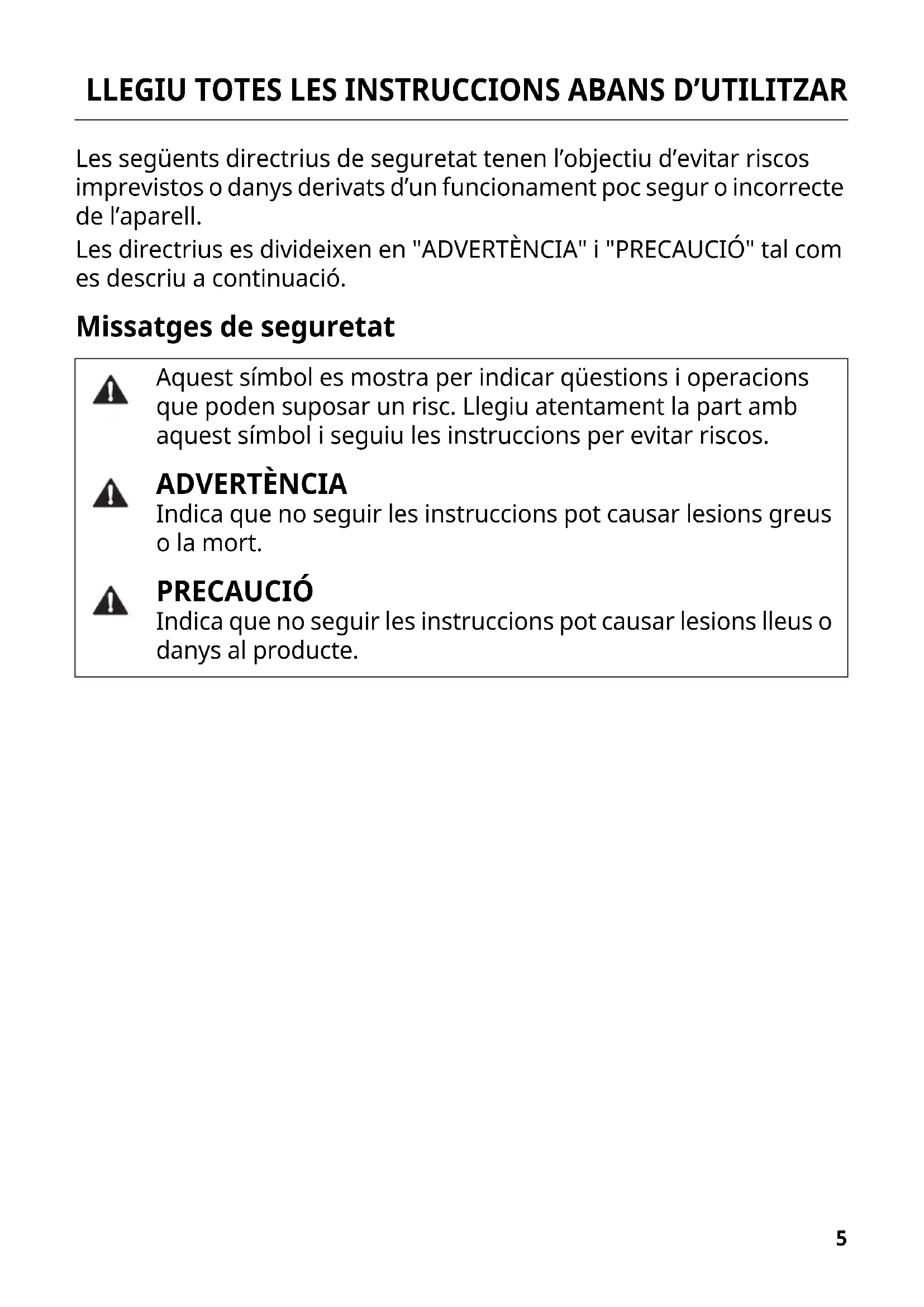 LLEGIU TOTES LES INSTRUCCIONS ABANS D’UTILITZAR Les següents directrius de seguretat tenen l’objectiu d’evitar riscos imprevistos o danys derivats d’un funcionament poc segur o incorrecte de l’aparell. Les directrius es divideixen en "ADVERTÈNCIA" i "PRECAUCIÓ" tal com es descriu a continuació. Missatges de seguretat Aquest símbol es mostra per indicar qüestions i operacions que poden suposar un risc. Llegiu atentament la part amb aquest símbol i seguiu les instruccions per evitar riscos. ADVERTÈNCIA Indica que no seguir les instruccions pot causar lesions greus o la mort. PRECAUCIÓ Indica que no seguir les instruccions pot causar lesions lleus o danys al producte.6 ADVERTÈNCIA ADVERT ÈNCIA WARNING Per tal de reduir el risc d’explosió, incendi, mort, descàrrega elèctrica, lesions o cremades a les persones que utilitzin aquest producte, seguiu les precaucions bàsiques, incloent-hi les següents: Seguretat tècnica