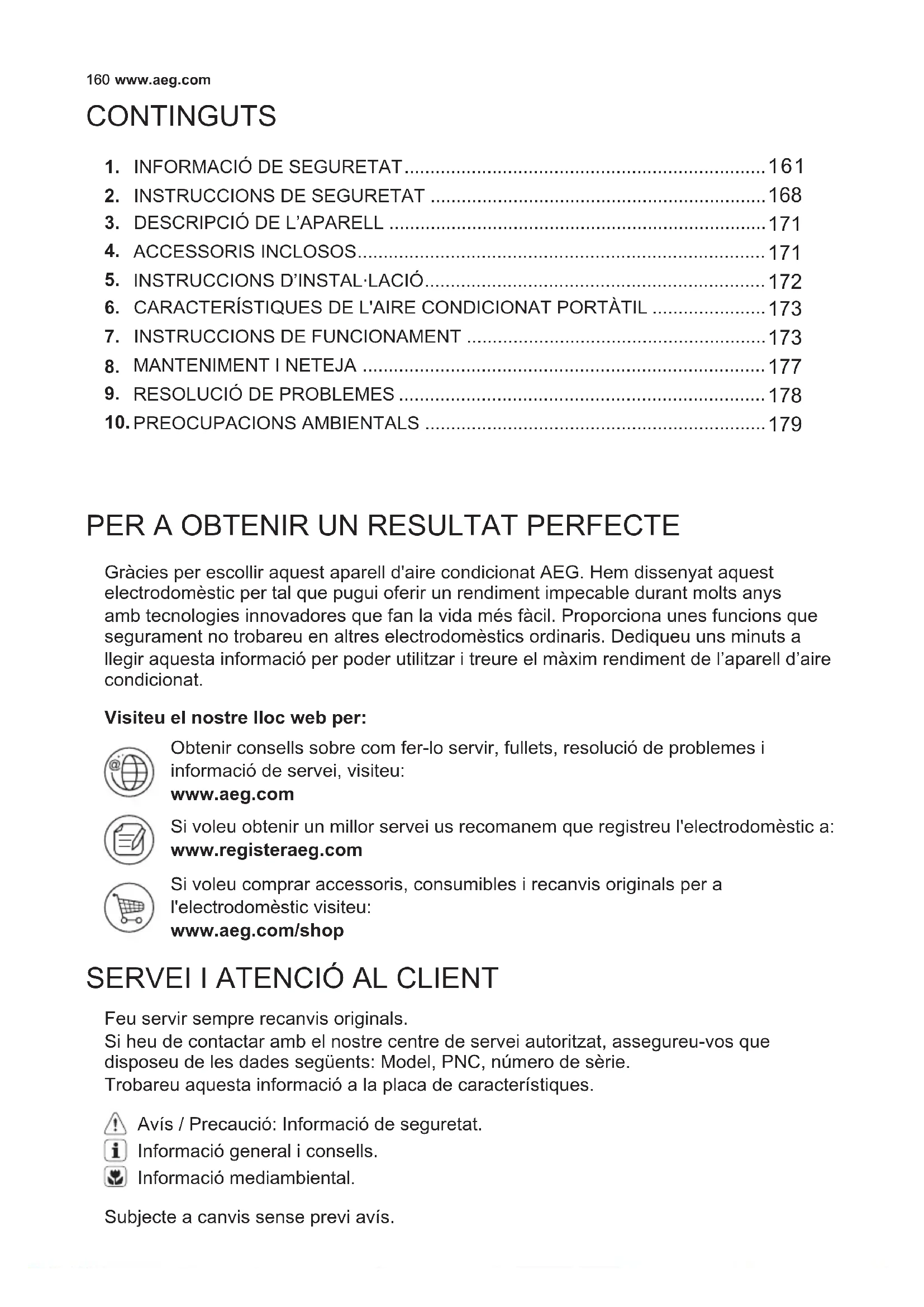 Gràcies per escollir aquest aparell d'aire condicionat AEG. Hem dissenyat aquest electrodomèstic per tal que pugui oferir un rendiment impecable durant molts anys amb tecnologies innovadores que fan la vida més fàcil. Proporciona unes funcions que segurament no trobareu en altres electrodomèstics ordinaris. Dediqueu uns minuts a llegir aquesta informació per poder utilitzar i treure el màxim rendiment de l’aparell d’aire condicionat. Feu servir sempre recanvis originals. Si heu de contactar amb el nostre centre de servei autoritzat, assegureu-vos que disposeu de les dades següents: Model, PNC, número de sèrie. Trobareu aquesta informació a la placa de característiques. Visiteu el nostre lloc web per: Obtenir consells sobre com fer-lo servir, fullets, resolució de problemes i informació de servei, visiteu: www.aeg.com Si voleu obtenir un millor servei us recomanem que registreu l'electrodomèstic a: www.registeraeg.com Si voleu comprar accessoris, consumibles i recanvis originals per a l'electrodomèstic visiteu: www.aeg.com/shop