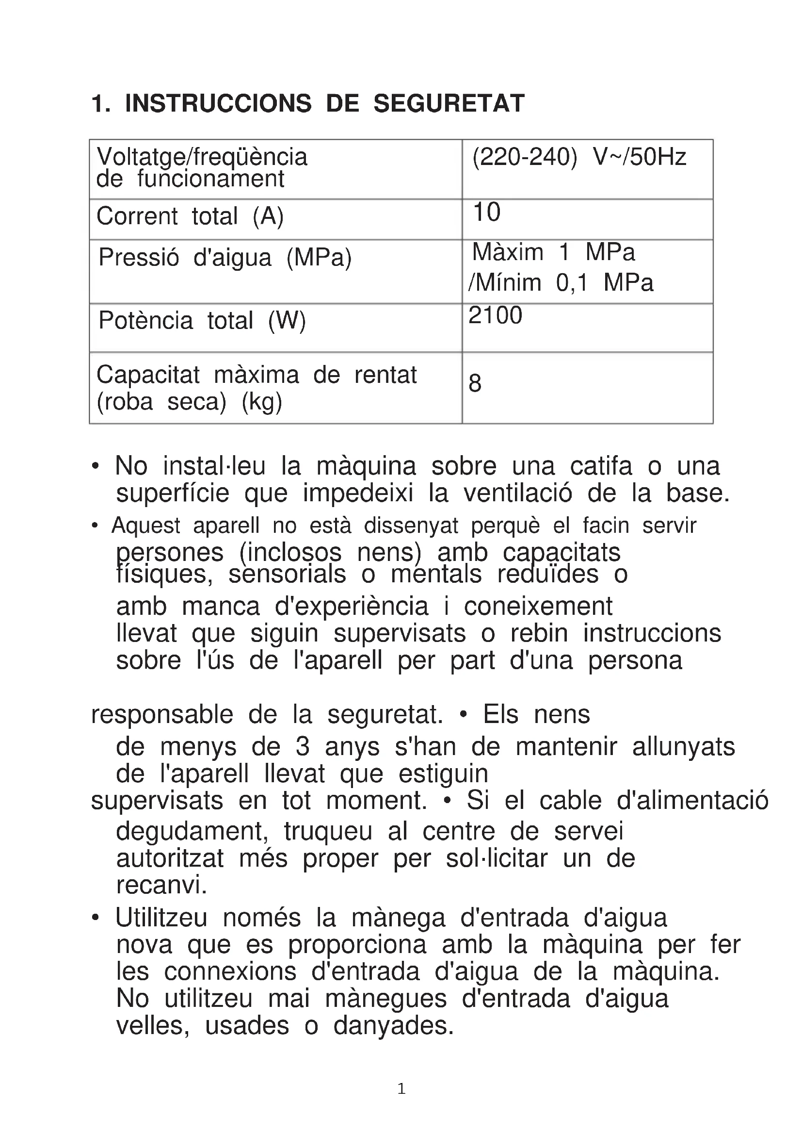 - Aquest aparell el poden fer servir nens de 8 anys en endavant i persones amb capacitats físiques, sensorials o mentals reduïdes o amb manca dexperiència i coneixement si han rebut supervisió o instruccions sobre lús segur de laparell i comprenen els perills associats. Els infants no han de jugar amb aquest aparell. Cap nen no ha de fer la neteja ni el manteniment d'usuari d'aquest aparell sense supervisió. • Utilitzeu la màquina únicament per rentar peces que estiguin etiquetades pels seus respectius fabricants com a apta per al rentat.