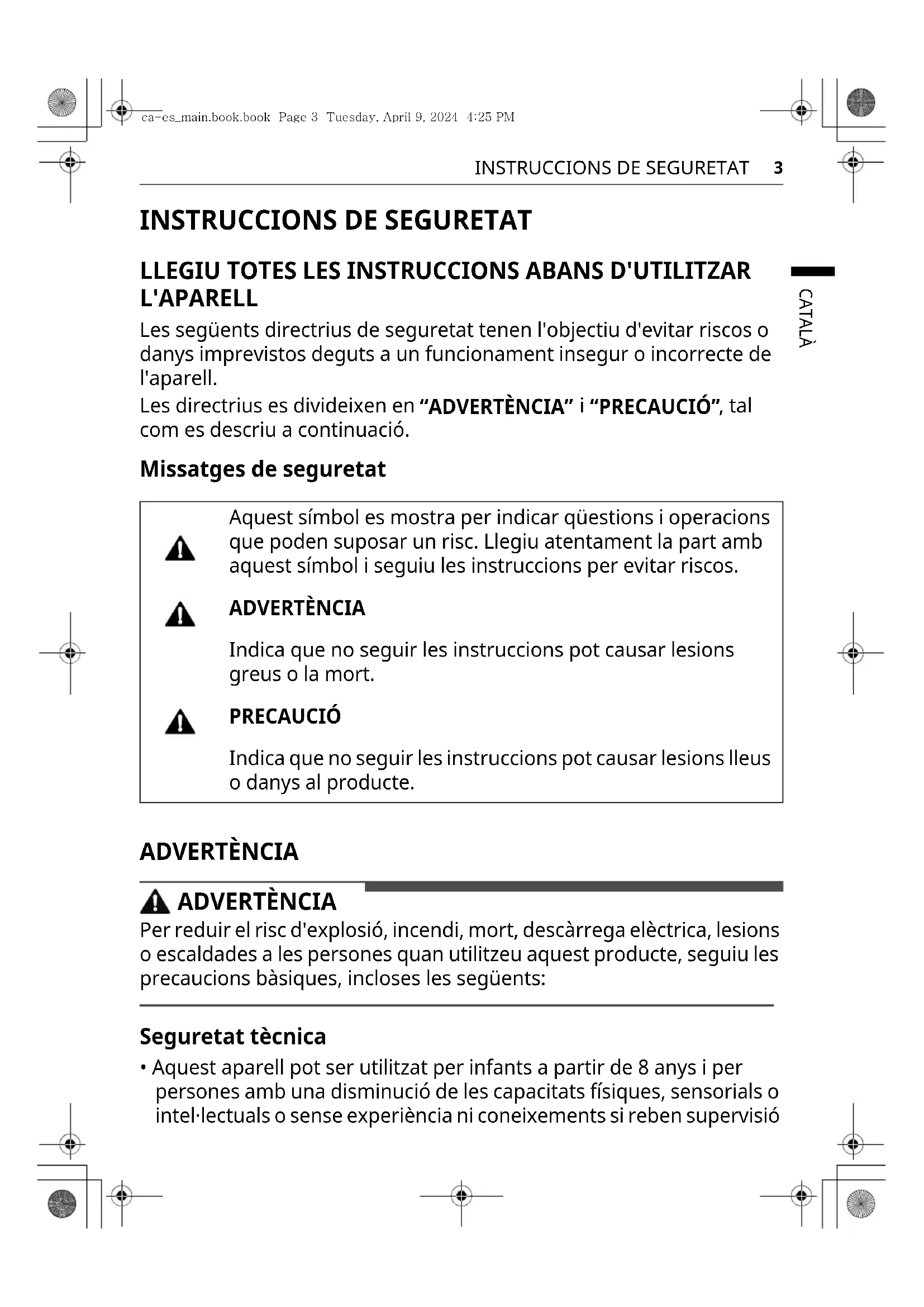 - Aquest aparell pot ser utilitzat per infants a partir de 8 anys i per persones amb una disminució de les capacitats físiques, sensorials o intel·lectuals o sense experiència ni coneixements si reben supervisió Aquest símbol es mostra per indicar qüestions i operacions que poden suposar un risc. Llegiu atentament la part amb aquest símbol i seguiu les instruccions per evitar riscos. ADVERTÈNCIA Indica que no seguir les instruccions pot causar lesions greus o la mort. PRECAUCIÓ Indica que no seguir les instruccions pot causar lesions lleus o danys al producte. ca-es_main.book.book Page 3 Tuesday, April 9, 2024 4:25 PM4